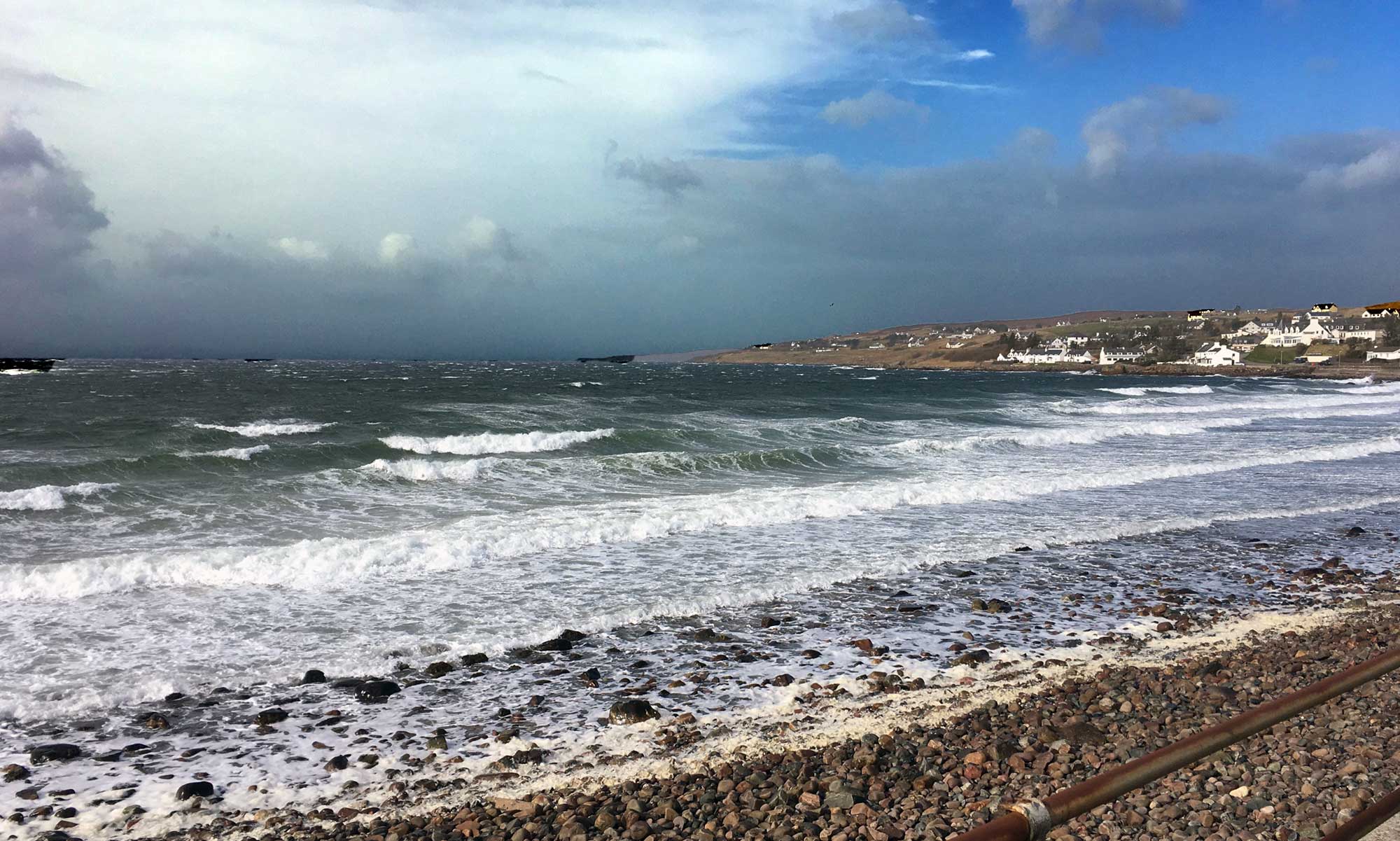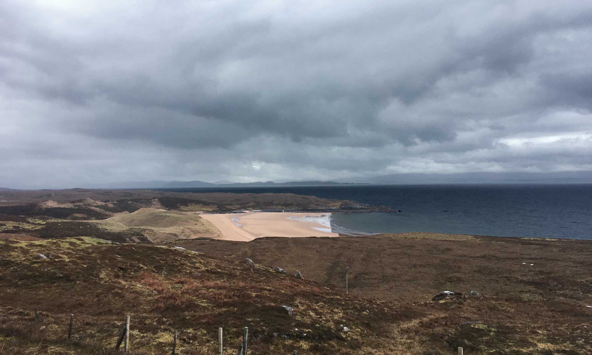 Heute fahren wir die North Coast 500 Richtung Aultbea und noch ein kleines Stück weiter bis zur Gruinard Beach. Es ist noch wolkig und kühl, doch es kündigt sich ein schöner Tag an. Ich parke auf dem Parkplatz gegenüber dem Eingang zum Strand. Wir wollen heute den Inverianvie River, der hier an dem Strand in das Meer mündet, bis zum Wasserfall hinaufgehen. 3 km, eine kleine Strecke, genau richtig für Blixa.