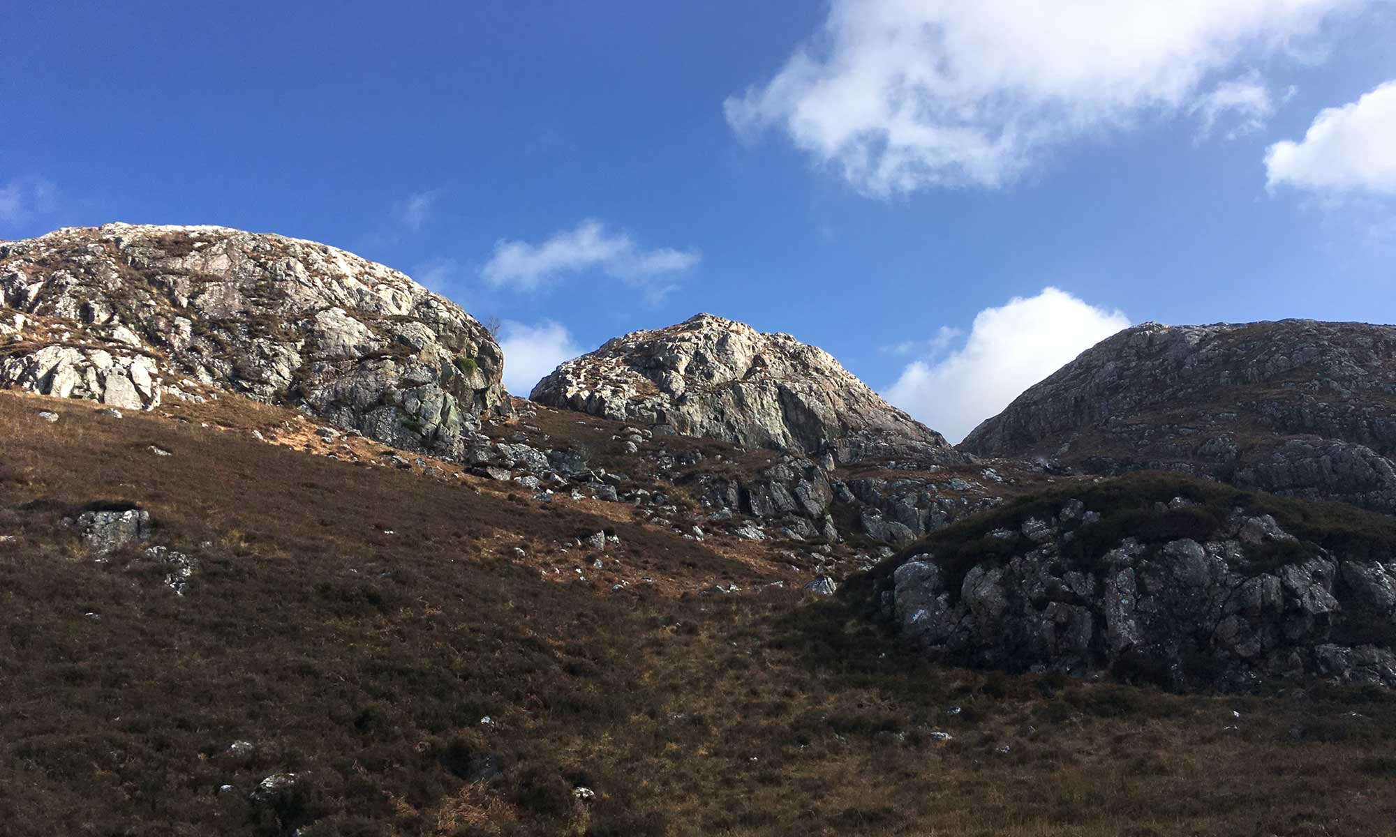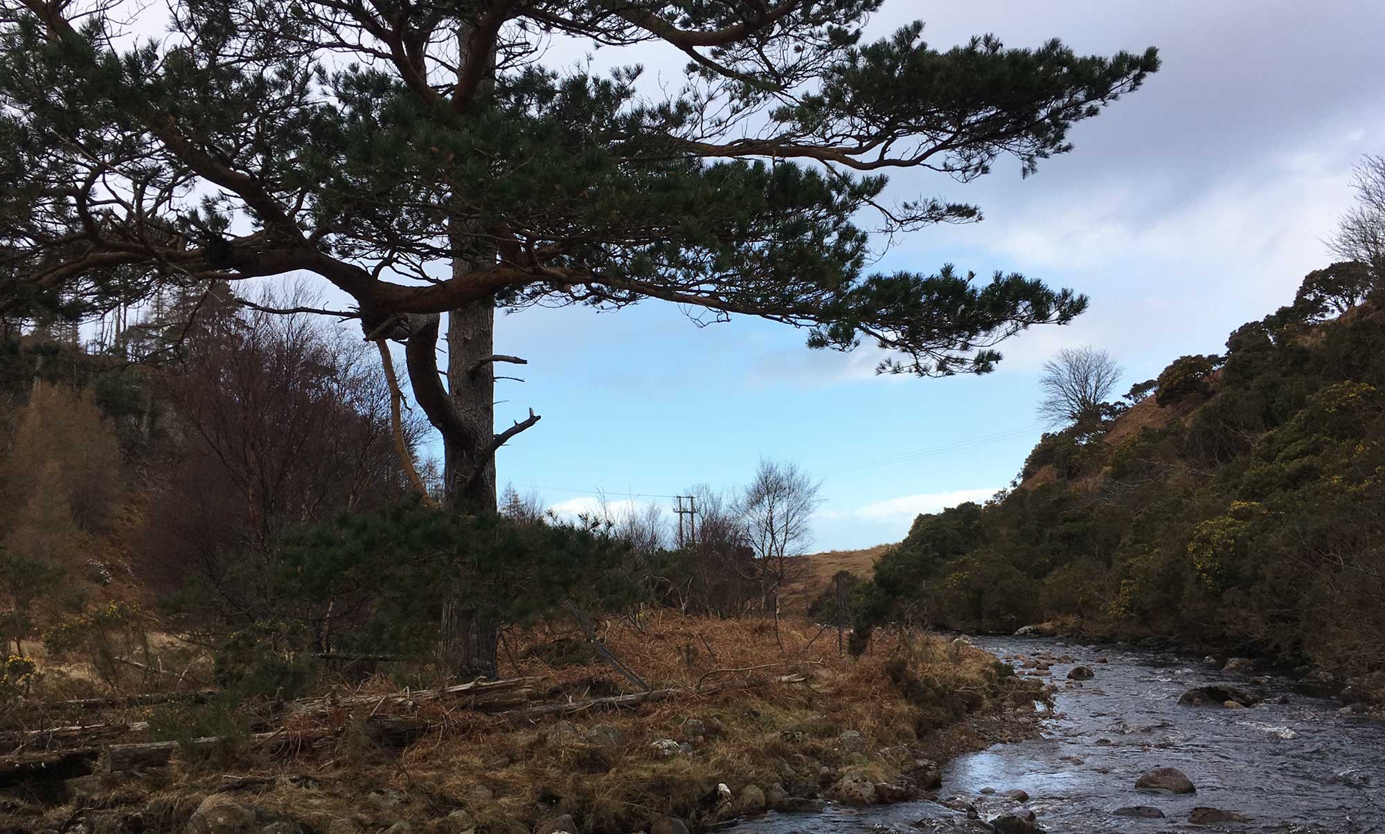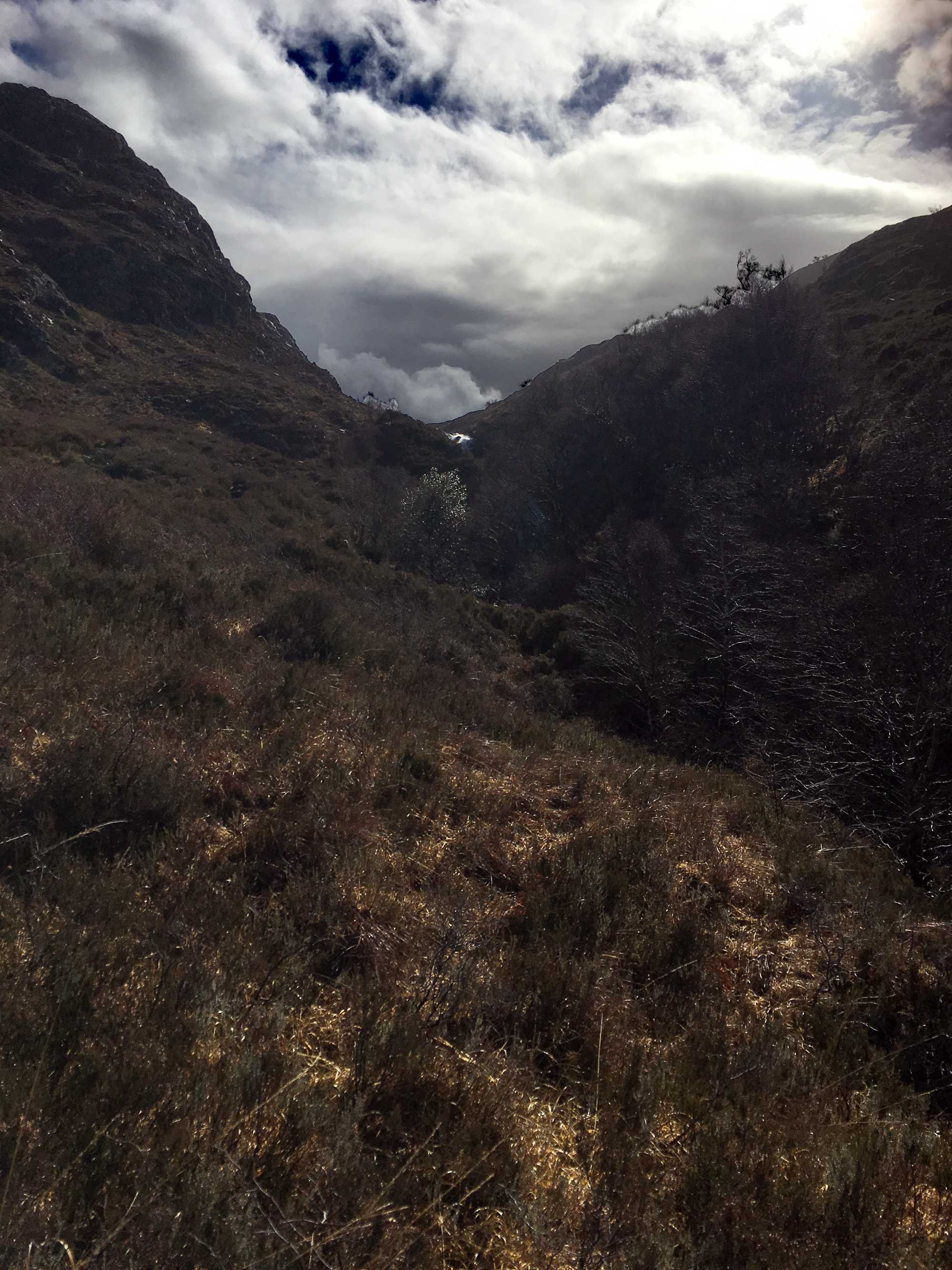 Der Weg zurück ist noch schwieriger als bergauf, ich muss aufpassen nicht auszurutschen und im Wasser zu landen, denn das ist überall. Tatsächlich ist der gesamte Untergrund neben dem Inverianvie eine Ansammlung von Minibächen, die sich ihren Weg in den Fluss bahnen.  Man denkt immer da hinten wird es trocken, aber es  wird nur verdeckt vom abgestorbenen Gras des Winters.