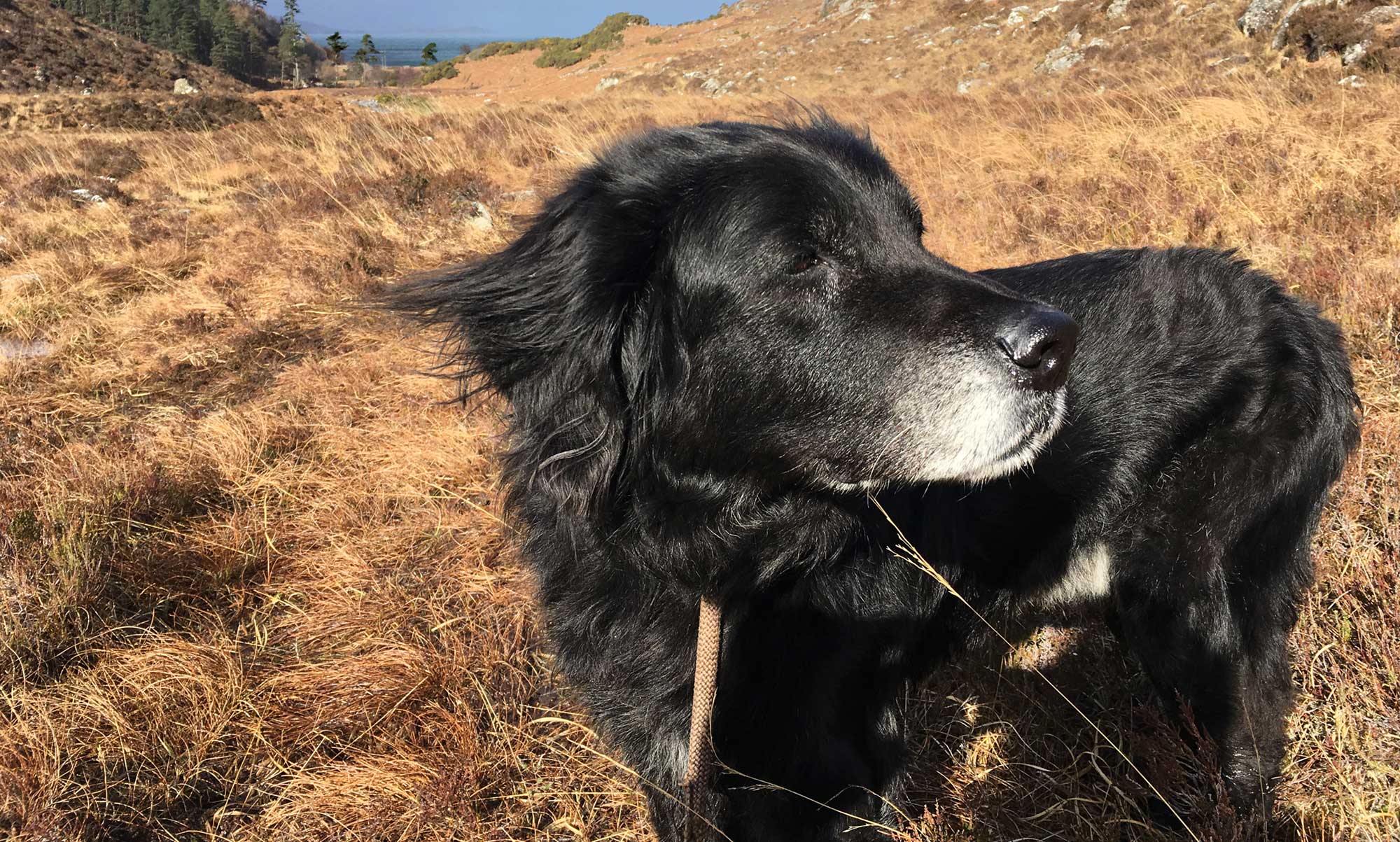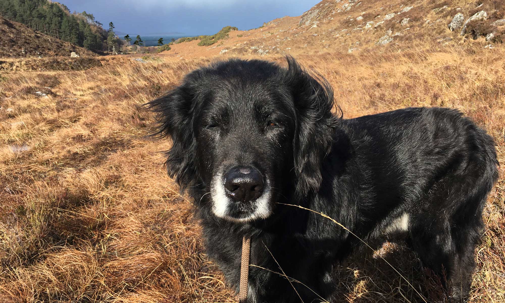 Heute fahren wir die North Coast 500 Richtung Aultbea und noch ein kleines  Stück weiter bis zur Gruinard Beach. Es ist noch wolkig und kühl, doch es kündigt sich ein schöner Tag an. Ich parke auf dem Parkplatz gegenüber dem Eingang zum Strand. Wir wollen heute den Inverianvie River, der hier an dem Strand in das Meer mündet, bis zum Wasserfall hinaufgehen. 3 km, eine kleine Strecke, genau richtig für Blixa.