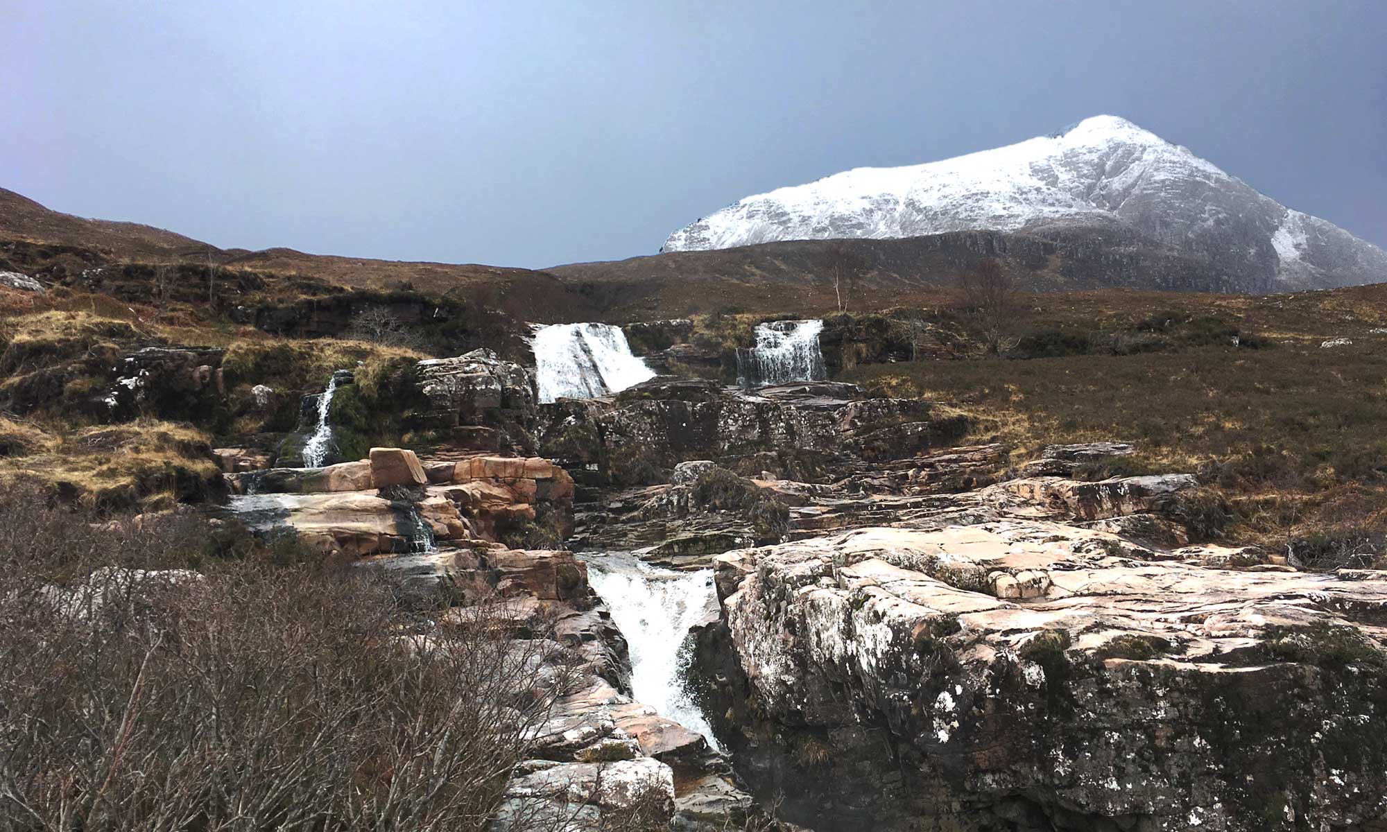 Nicht nur der Blick auf das rauschende Wasser, den schneebedeckten Berg, auch der Blick hinunter zum Little Loch Broom ist unbeschreiblich. Wir rasten ein wenig und genießen die Aussicht, dann geht es wieder hinunter.