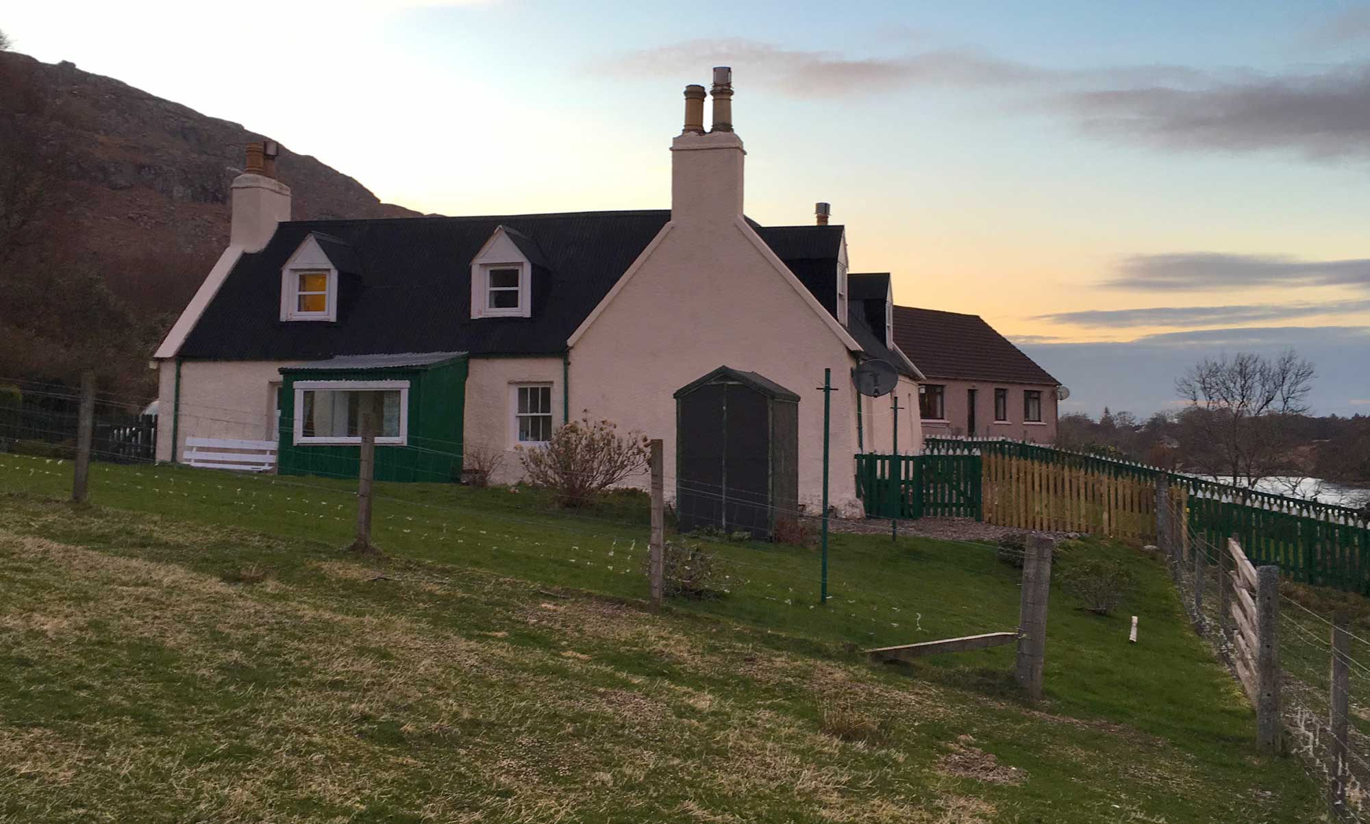 Wir sind schon am Hang vor dem Haus, ich mache ein letztes Foto vom Cottage.