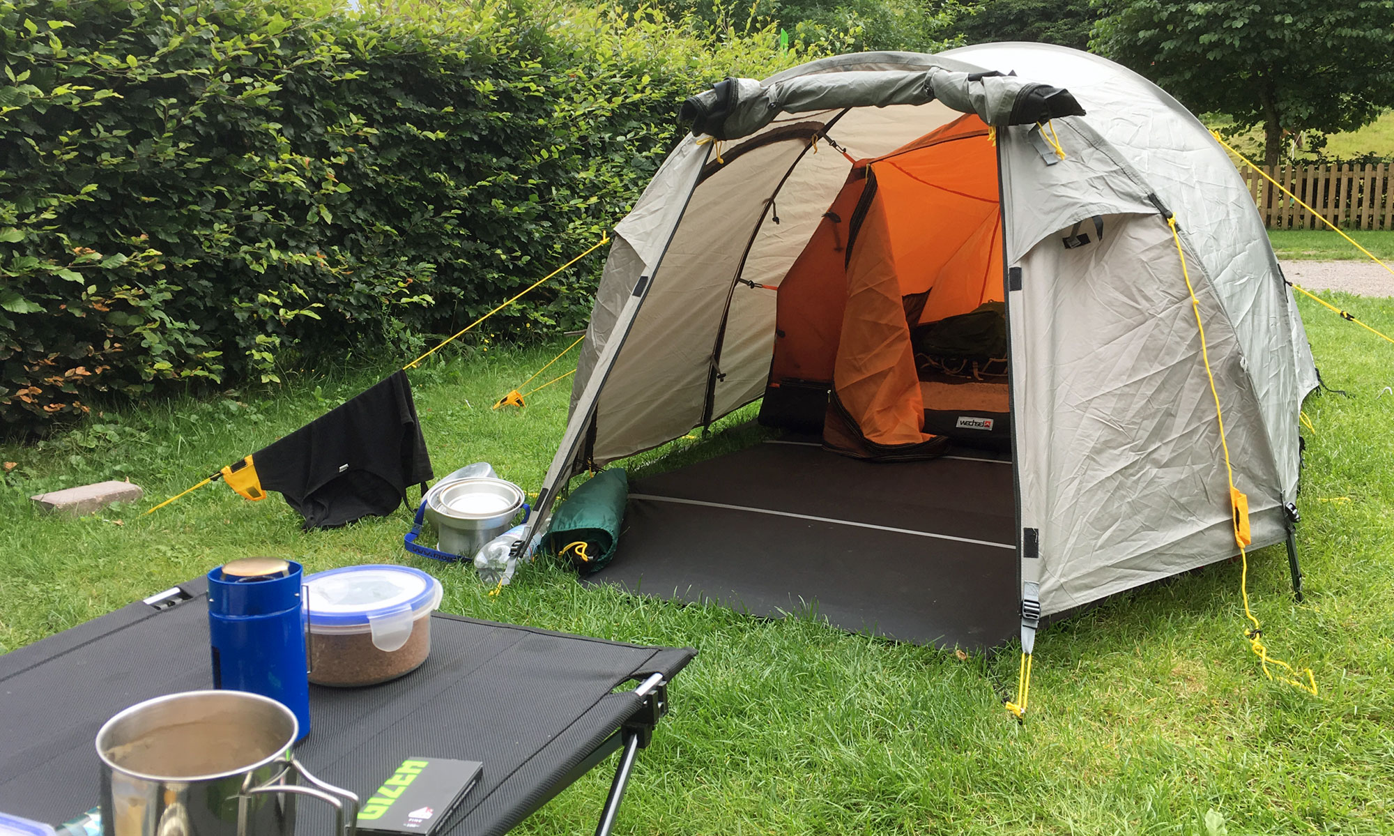 Im Zelt schlafen hat prima geklappt, aber das hatten wir zu Hause im Garten bereits eine Nacht geübt. Das Tunnelzelt mag er aber mehr, da er ganz hinten liegen kann. Der einsetzende Regen hat uns ein Schlaflied gesungen.