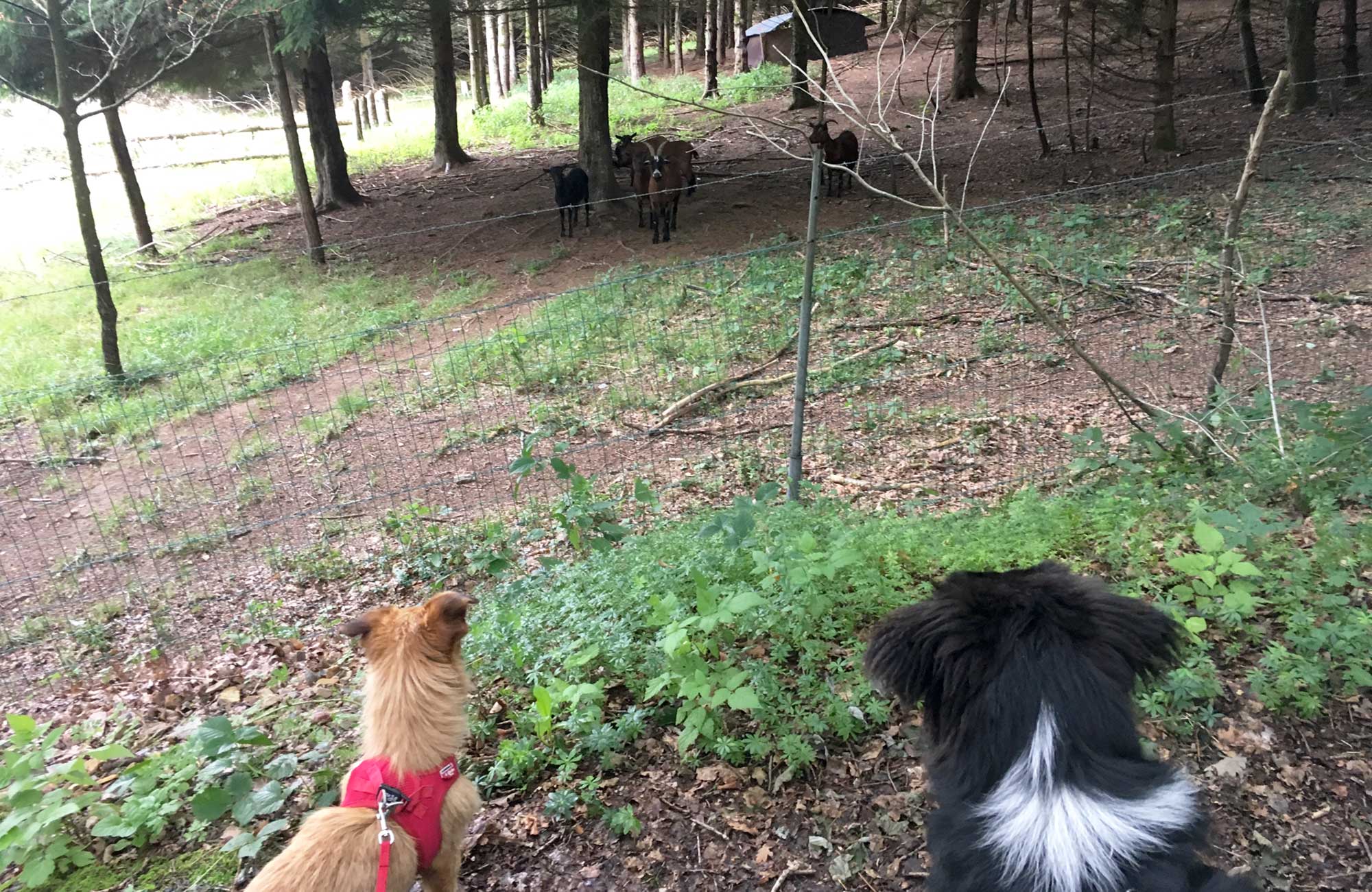 Also Aufbruch. Wir begegnen noch einigen Anglern und nach einer Brücke beginnt der Weg hoch nach Tirimont, einer kleinen Siedlung, man nennt es auch Weiler. Es beginnt leicht zu regnen, wieder schlecht für ein paar Panorama Fotos, Schade. Denn der Blick hinunter auf das Ameltal ist sicher bei guter Sicht einzigartig. Wir durchqueren die vereinzelt anzutreffenden Häuschen und es geht wieder bergab. Da sehen meine Hundis ein paar Böcke und wollen einfach nicht weiter gehen, Voll Fasziniert die Zwei.