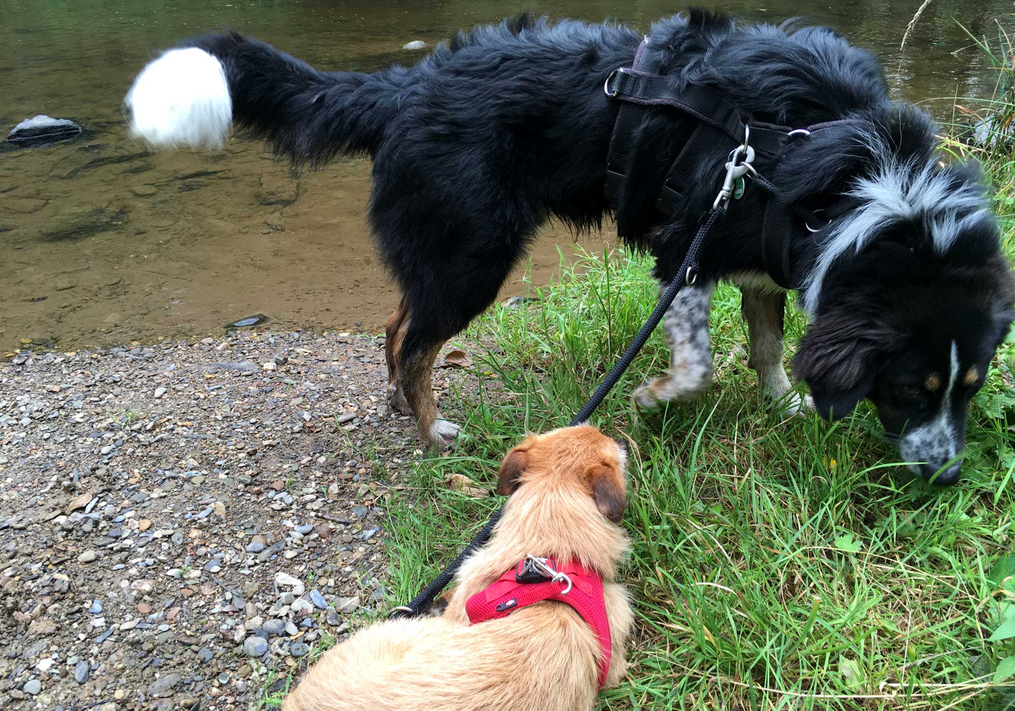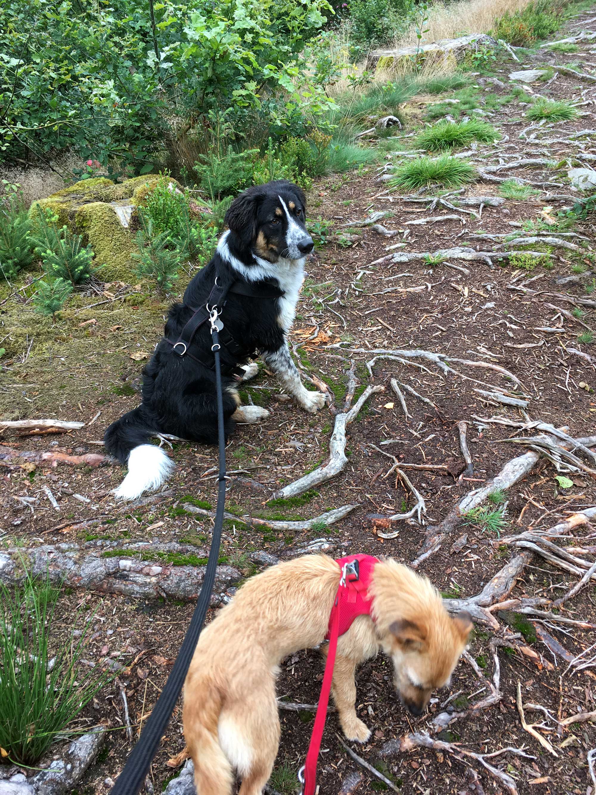 Wandern mit zwei Hunden, die noch nicht gelernt haben koordiniert und folgsam zu gehen ist Stress. Mir entgehen oft Dinge am Wegesrand, weil ich zu konzentriert auf die Hunde achte. Meist legt sich das im Laufe des Weges, aber ich sehne mich nach mehr Ruhe in meinem Wander Umfeld. Und man kommt höllisch ins Schwitzen beim vielen Korrigieren der Hunde!