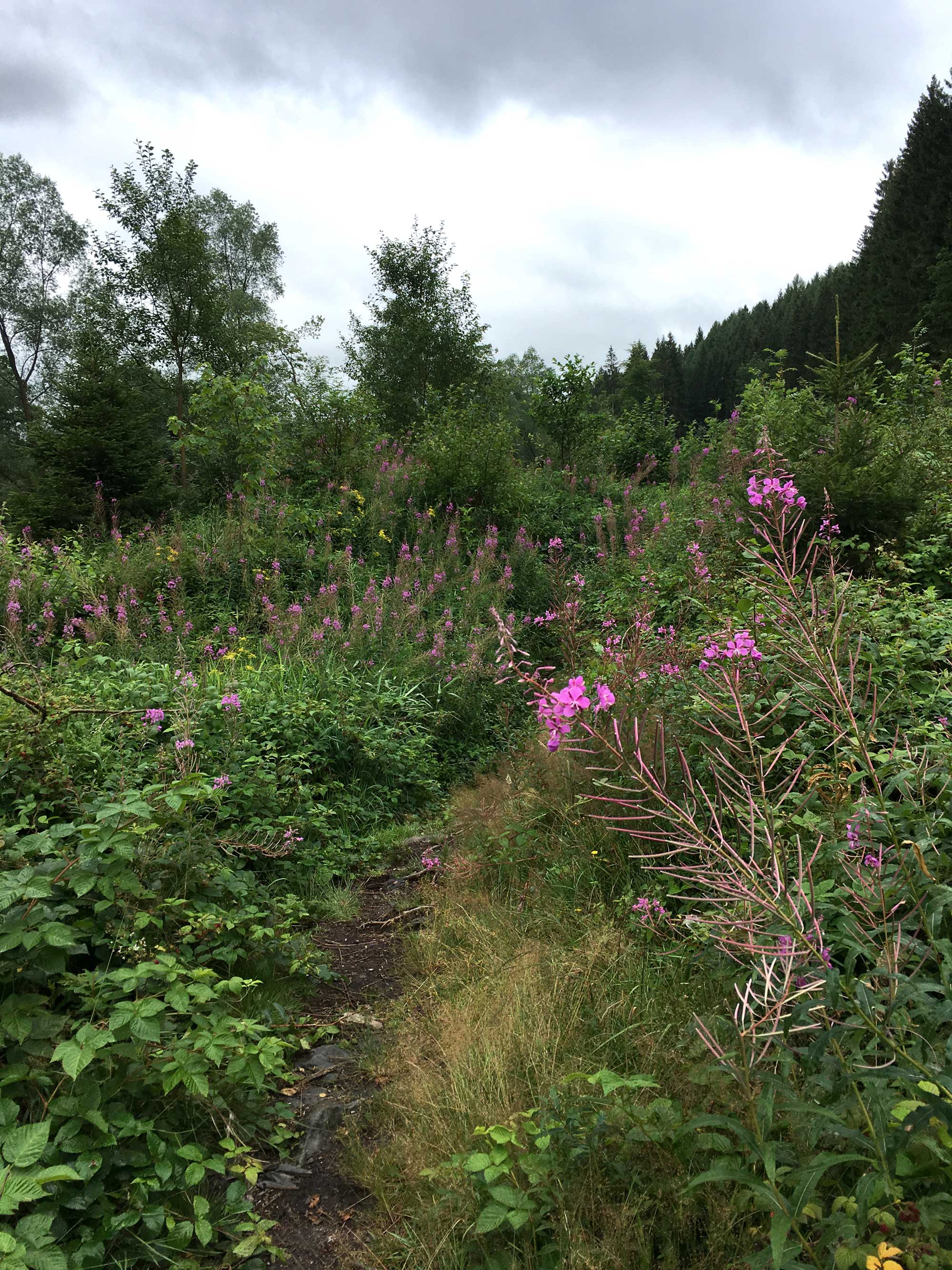 Wir folgen der Amel auf teilweise sumpfigem Untergrund, kommen an einigen Häusern vorbei, die wir umrunden, und nach der Brücke, die uns wieder auf die andere Seite der Amel führt entdecken wir Spuren der früheren Goldwäscher. Wir gehen auf einem schmalen Pfad. Teils über Wurzeln, teils durch die hohe Ufervegetation entlang der Amel. Oft sehen wir die Amel nicht, aber das Rauschen klingt herüber. Es ist einfach unbeschreiblich, wäre nicht die Strasse so nah und die Geräusche ab und zu vorbeifahrender Autos zu hören.