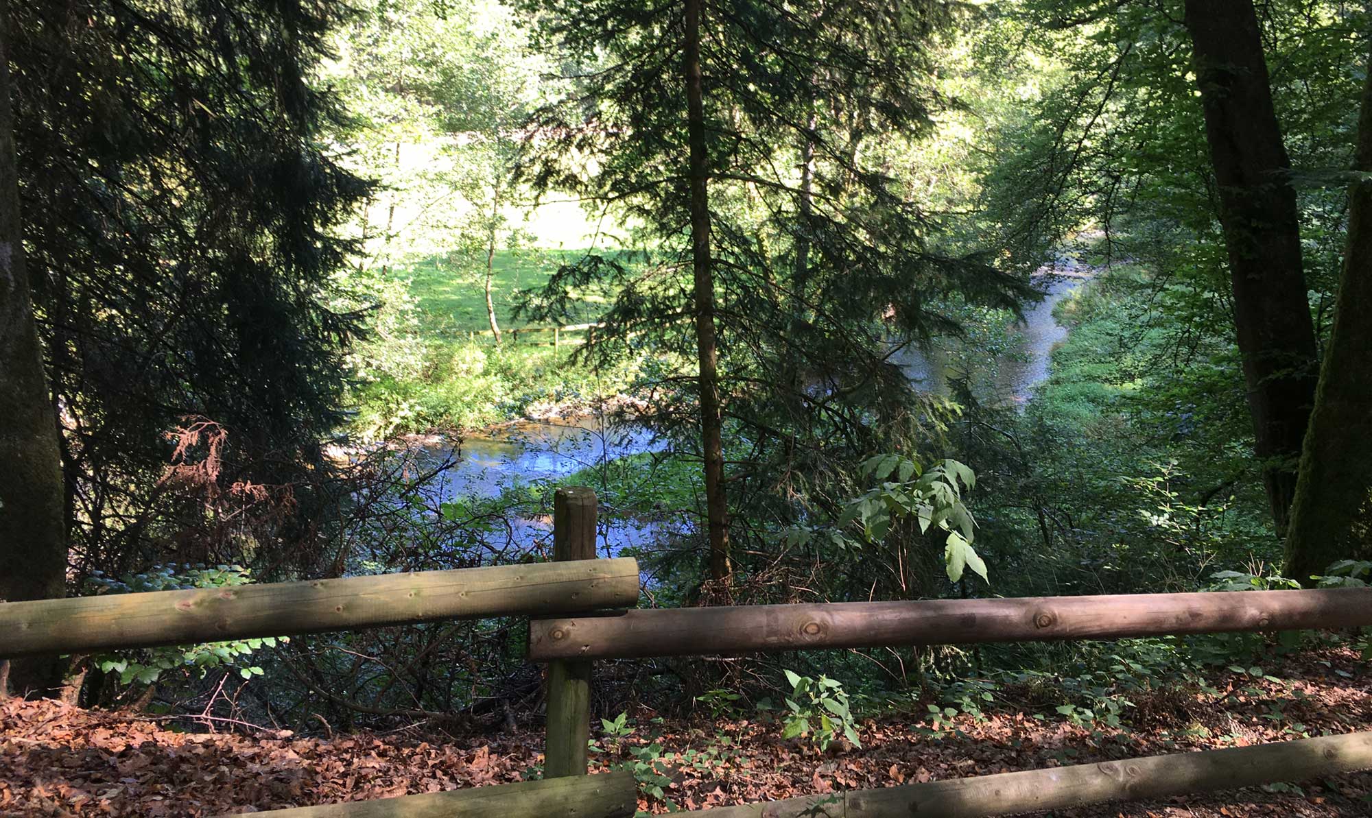 Nach gefühlsmäßig einer Ewigkeit konnten wir endlich den breiten Weg verlassen und es ging durch den Tannenwald auf einem weichen Pfad hinunter zur Strasse und zur Amel. Jetzt hatten auch die Hunde mehr Spaß und Mozart hörte auf nach vorn zu ziehen und mein Schritttempo ungewollt zu erhöhen. Rasen muss ja nicht sein!