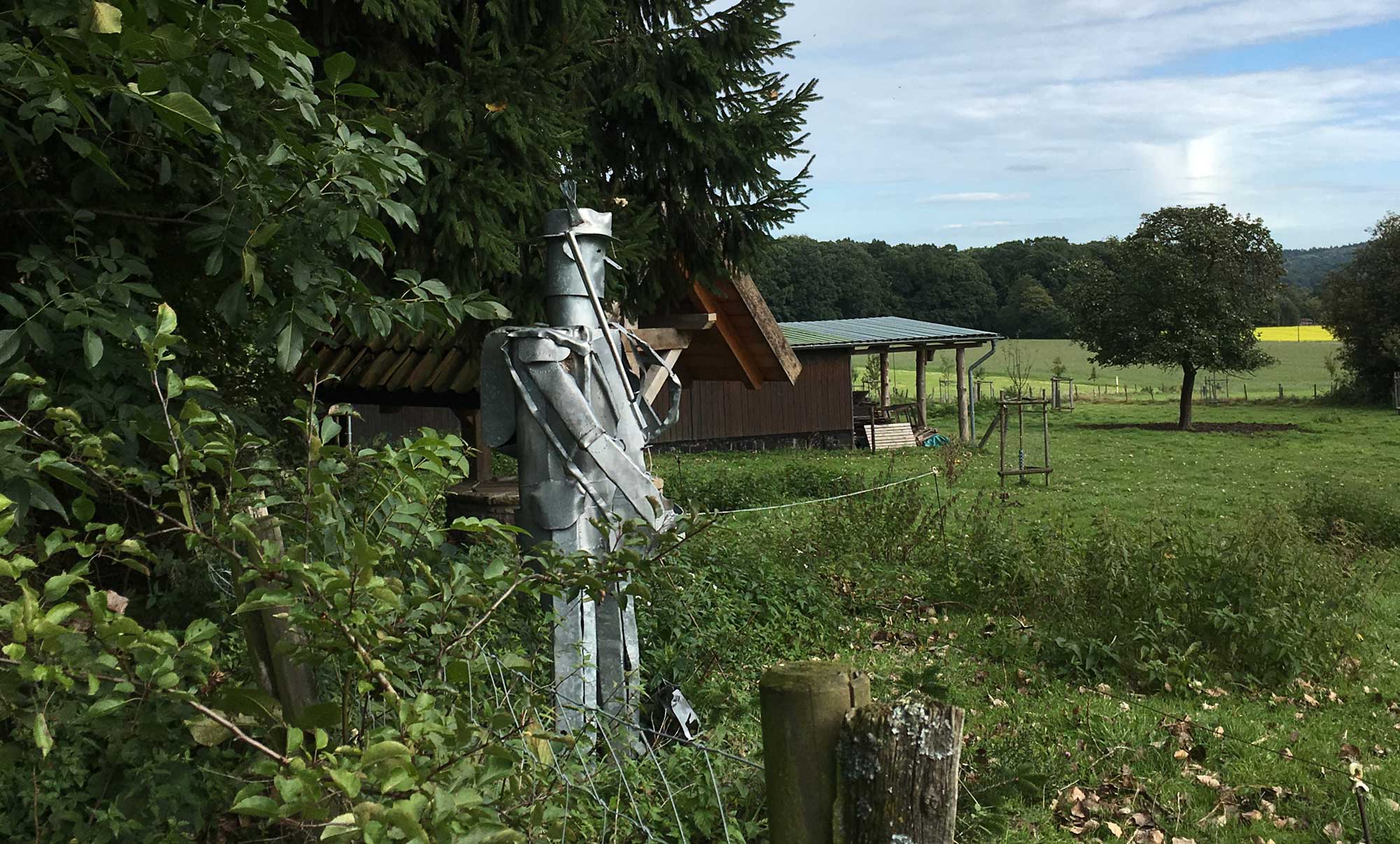 Der Wechsel zwischen Wald und Dorf und Feldern gefällt mir besonders, es wird nie eintönig, das Auge hat immer etwas Neues zu entdecken. Den Hunden gefallen die Waldabschnitte jedoch am besten. Unterwegs treffen wir sogar den Blechmann aus dem Wizard of Oz. Im nächsten Waldabschnitt führen Holzbrücken immer wieder über Bäche. Die Hundis freuen sich, Wasser!