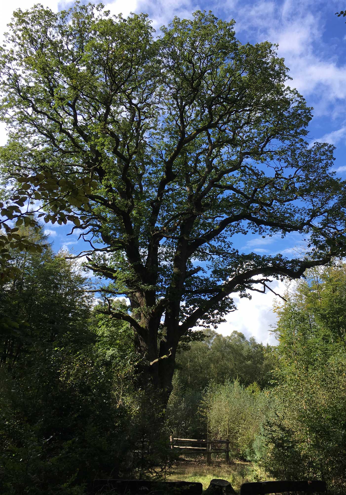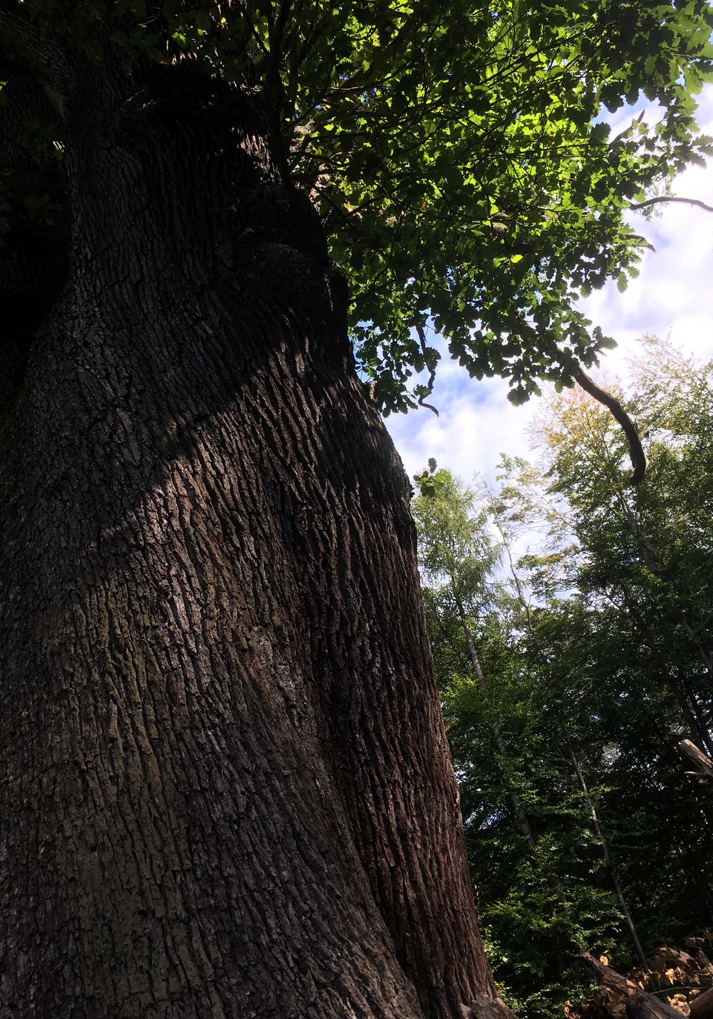 Am Europaplatz. Warum und wer ist bloß auf die Idee gekommen den Ort Europaplatz zu nennen. Es ist ein Parkplatz und der Eingang zum Naturschutzgebiet. Hilfe, der Eingang hat eine Kuhsperre und wir müssen da rüber. Nebenher geht kein Weg vorbei. Mein alter Hund Blixa hat sich immer geweigert über so etwas zu gehen, aber Mozart der Verrückte, dem macht das nichts. Phieby schlepp ich unterm Arm rüber. Es geht runter von dem breiten Weg, auf einem Trampelpfad Richtung Dicke Berta, einer uralten Eiche. Mehr als 500 Jahre alt. Wie viele Menschen hat der Baum gesehen, wie viele Kriege überlebt, wie viele Vögel in ihm genistet?