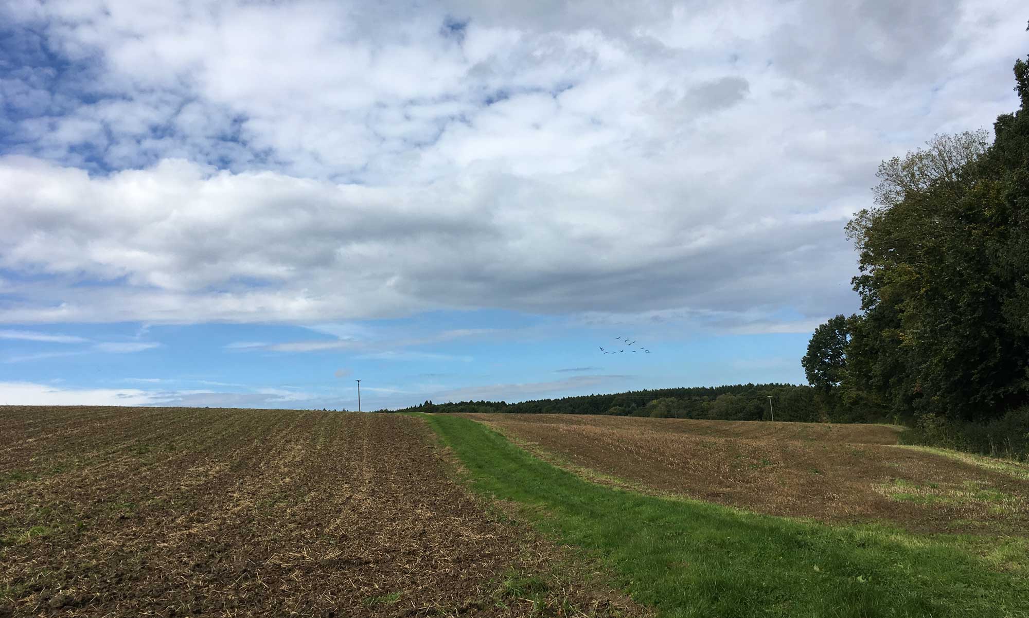 Es geht Richtung Süden, die Sonne scheint, wir wandern zwischen Waldrand und Feldern. Ein Bussard zieht seine Kreise und dann taucht plötzlich mit Getöse eine Gruppe Wildgänse auf, die sich zum Flug in den Süden sammeln.