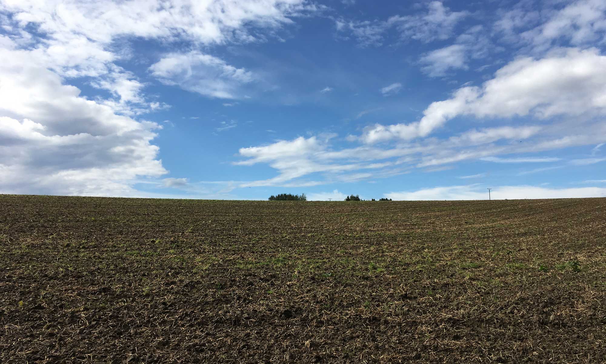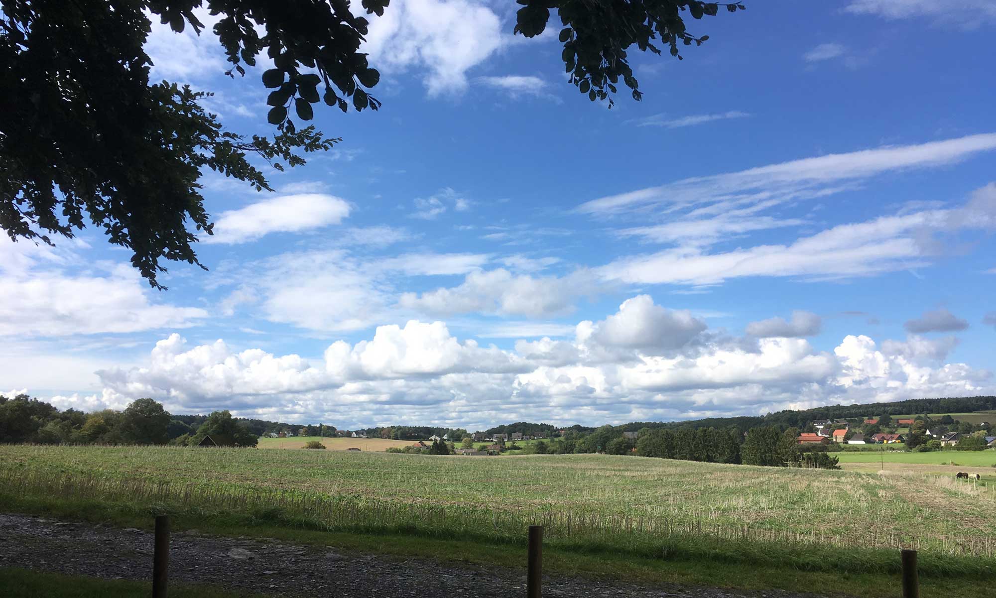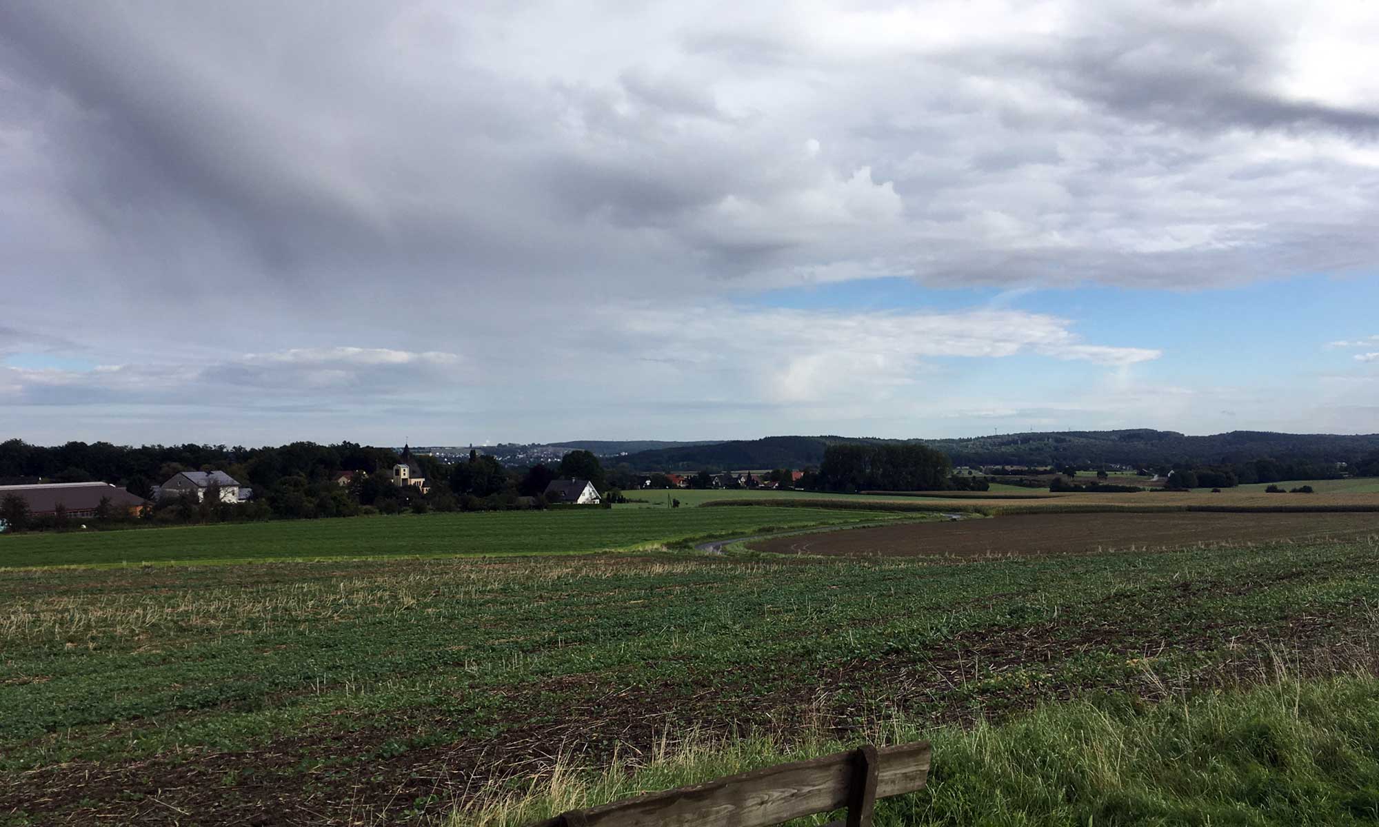 Niederoesbern streifen wir nur kurz und nach einem kurzen Waldstück gehen wir erneut am Waldrand entlang. Es öffnet sich der Blick auf ein wunderschönes Panorama im Sonnenschein mit himmlischen Wolkenbildern. Zeit für eine ausgedehnte Rast mit Snack für Mensch und Hund auf einer Bank, denn Mozart ist noch zu jung, um die gesamte Strecke an einem Stück zu laufen.