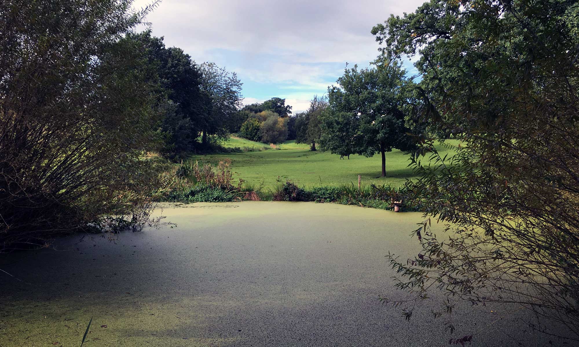 Meine zwei Hunde und ich starten am vorher erwähnten Hexenteich. Es ist 10 Uhr, es regnet. Nach kurzer Zeit treffen wir auf das O, unser Wegweiser für die nächsten 12,5 km. Der Weg ist schmal und geht durch hohes Grass, zum Glück hält meine Regenhose die Feuchtigkeit ab.