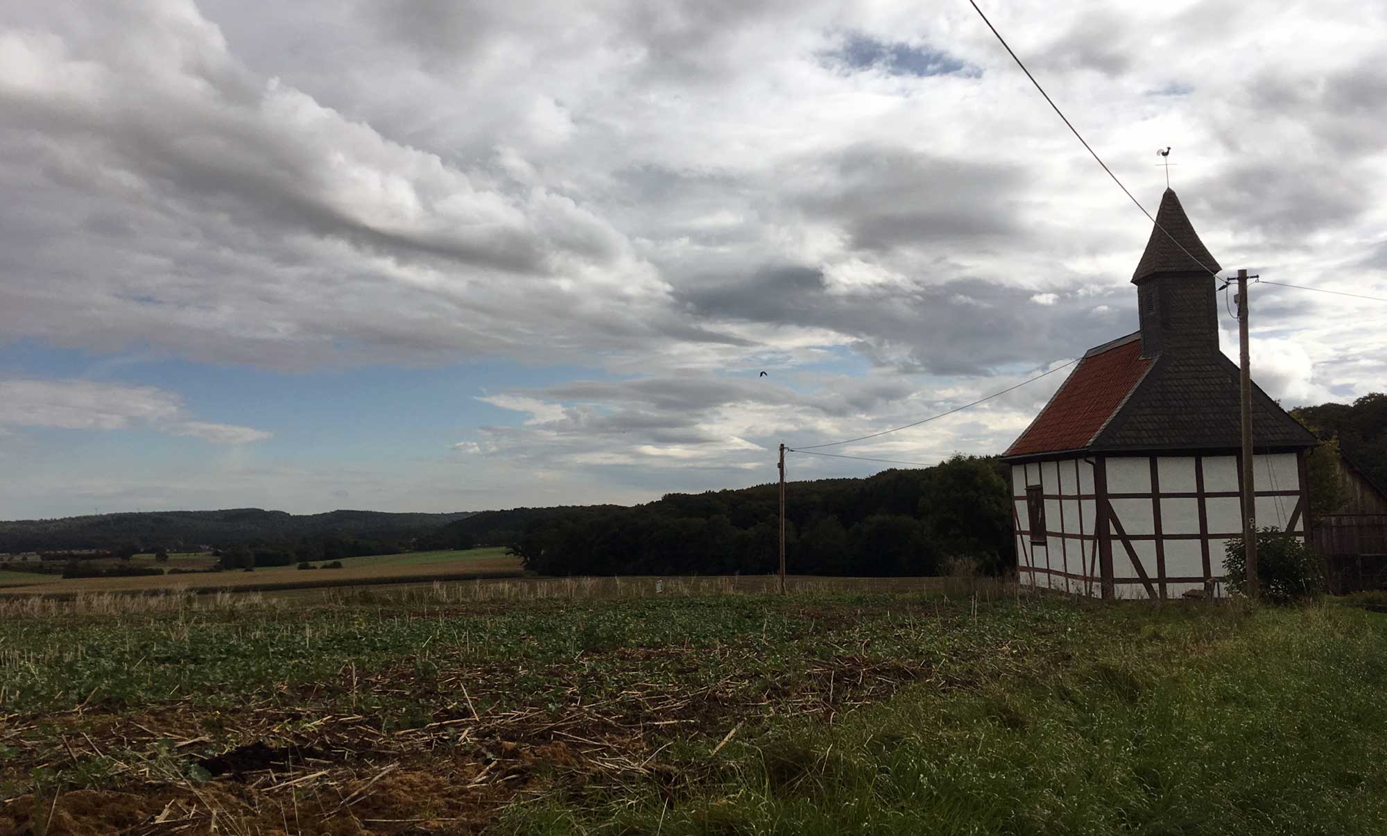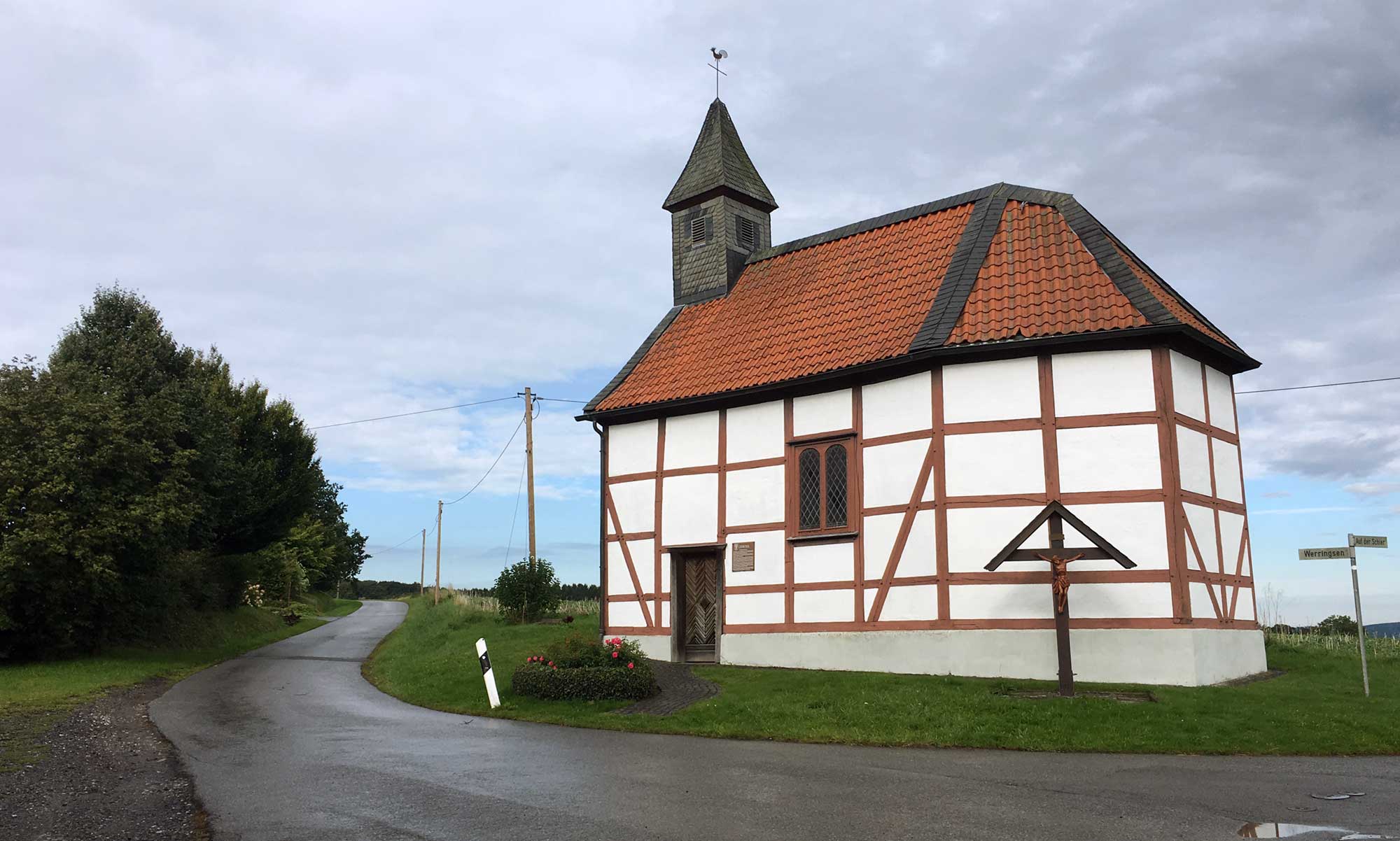 Der Himmel wird immer blauer und nach dem Hof Korbe biegen wir auf einer schmalen Strasse Richtung Werringsen ab. Auf uns wartet ein wunderschöner Rundblick über das Ruhrtal, und in der Ferne sieht man die Häuser von Wickede. In Werringsen kommen wir an romantischen Gehöften vorbei, so manche Kuh blickt uns leicht dümmlich an und wir erreichen die Fachwerk Kapelle St. Michaelis. Landluft!