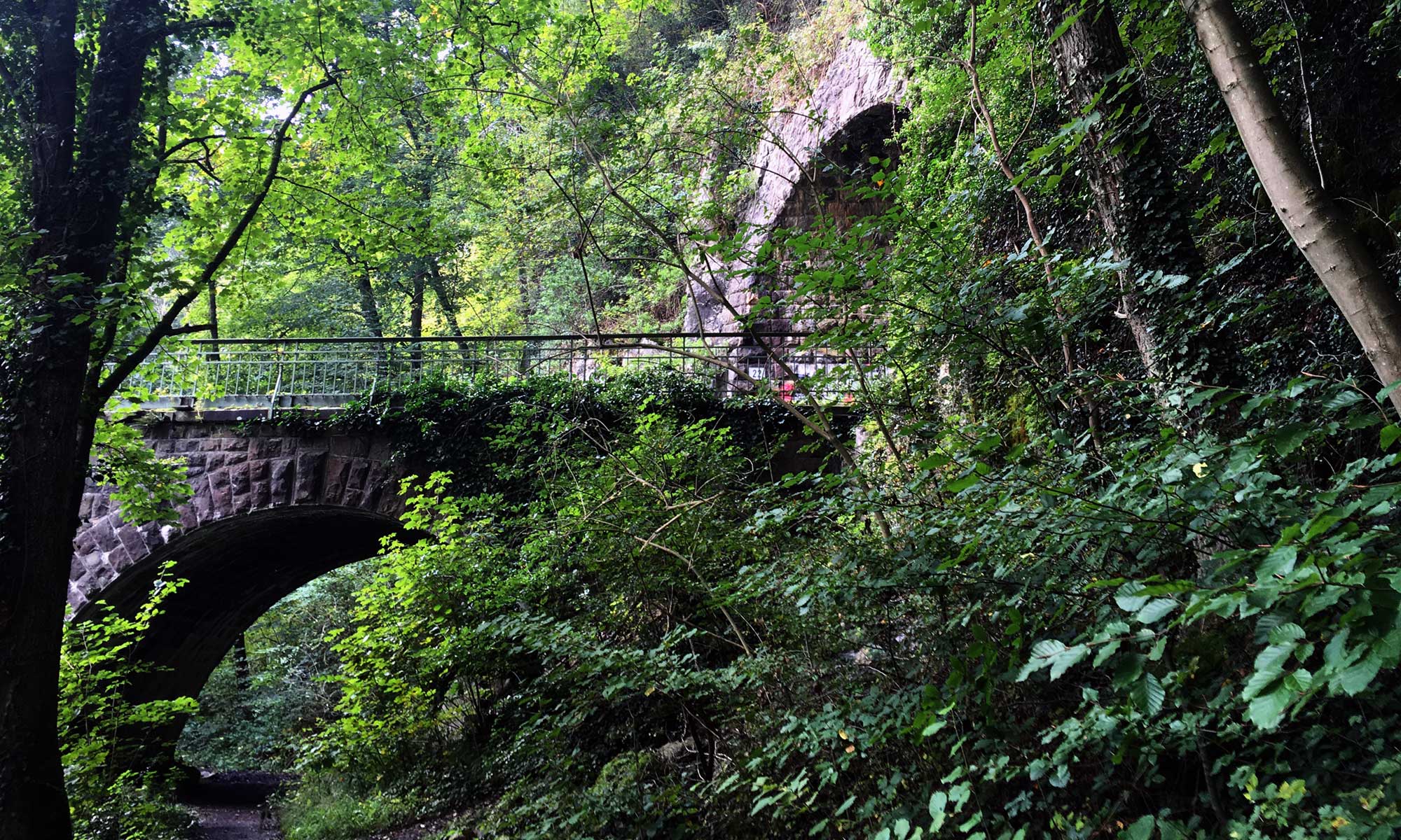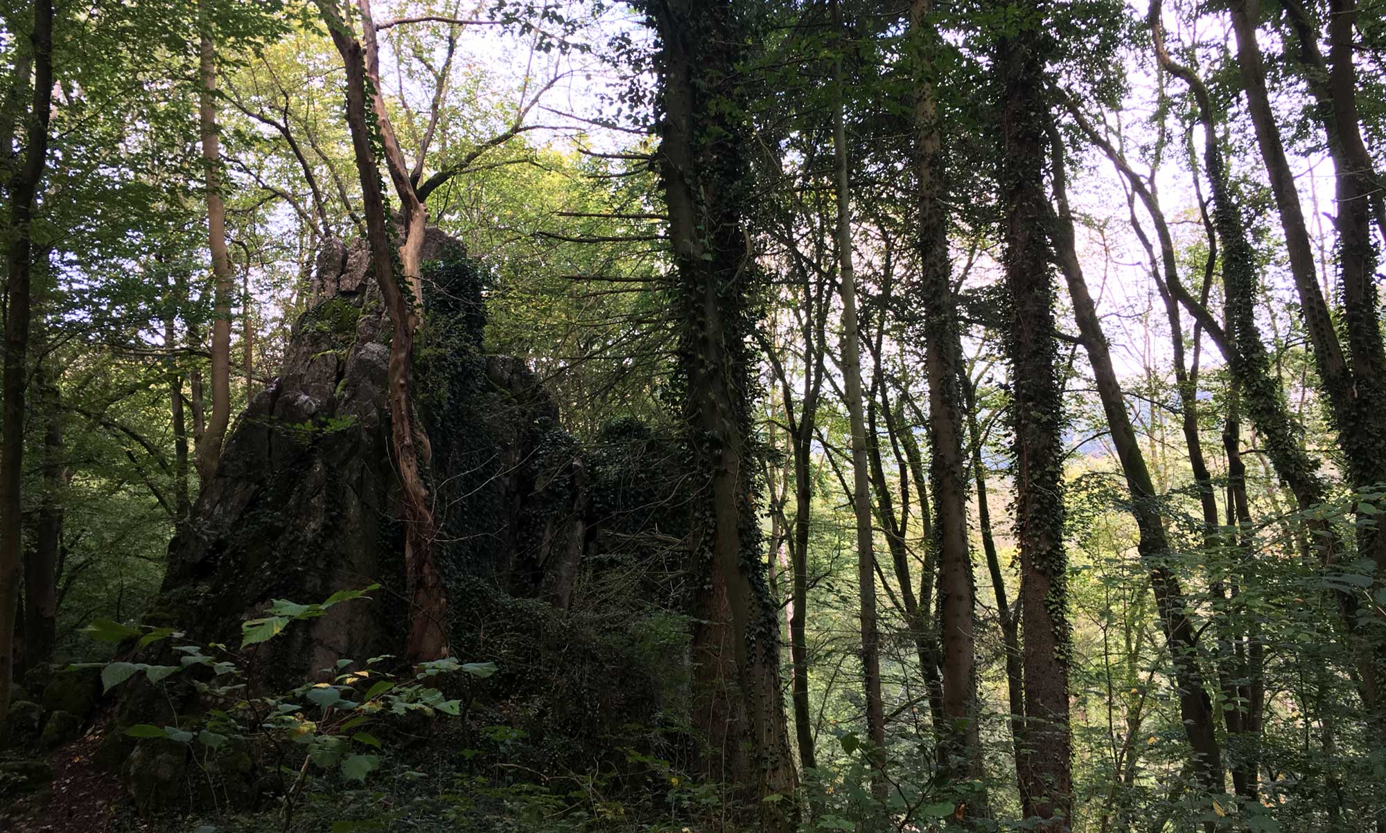 Danach geht es weiter an der Hönne entlang Auf der Hangseite werden die Felsbrocken und Felsformationen immer gewaltiger. Bis vor einigen Jahren wurde hier noch viel geklettert, das ist aber klugerweise Verboten worden, nachdem sich einige Kletterer nicht nur verletzt, sondern auch zu Tode gestürzt haben. Immer wieder sieht man kleine Höhlen im Gestein.