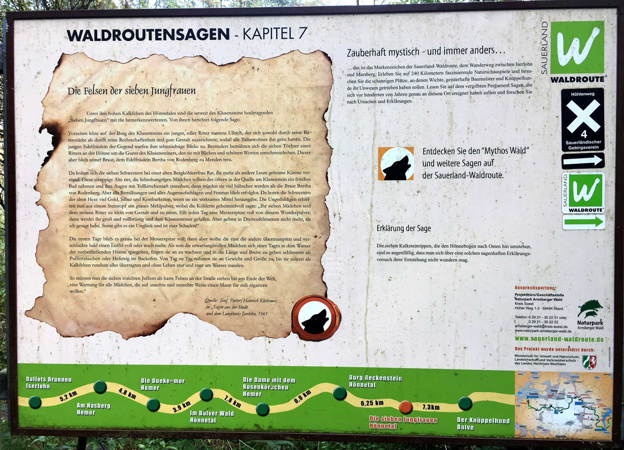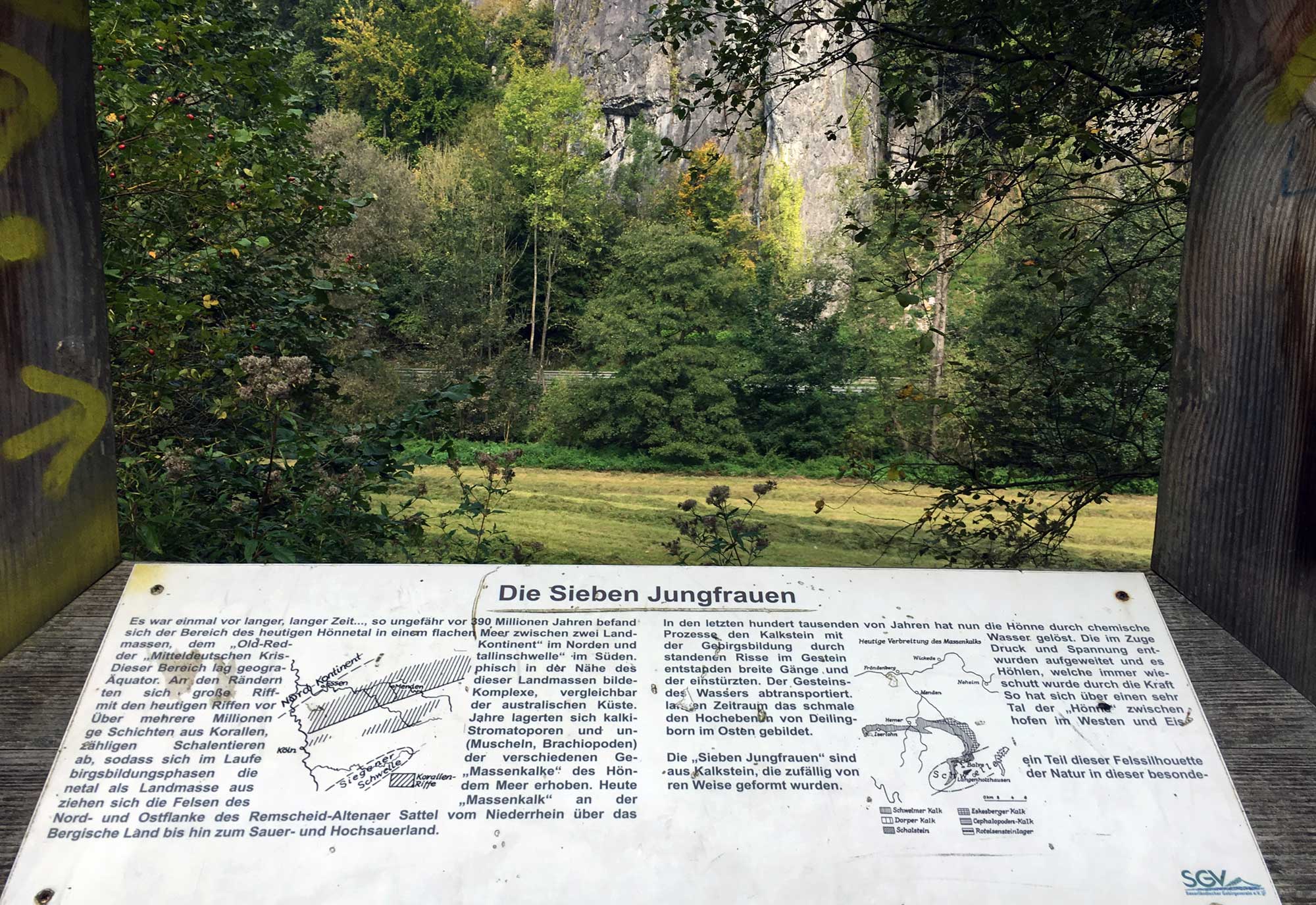 Das nächste Highlight folgt auf dem Fuß, wir treffen auf die Sauerländer Waldroute und die Geschichte von den Jungfrauen, die von einem Liebestrank nicht genug bekommen konnten und wuchsen und wuchsen, bis sie riesengroß waren und zu Stein wurden. Und alles nur, weil sie dem Junker der Burg Klusenstein schöne Augen machen und ihn erobern wollten. Pech gehabt!