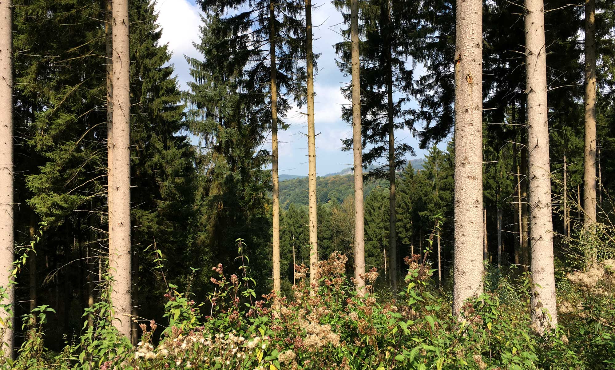 An manchen Stellen hat man einen schönen Blick über die Bäume oder durch sie hindurch zur auf der anderen Seite liegenden Hochebene. Nur eine Sache stört hier die Stille, und das sind die Moorräder, die aus dem Tal hinauf dröhnen, besonders am Wochenende.