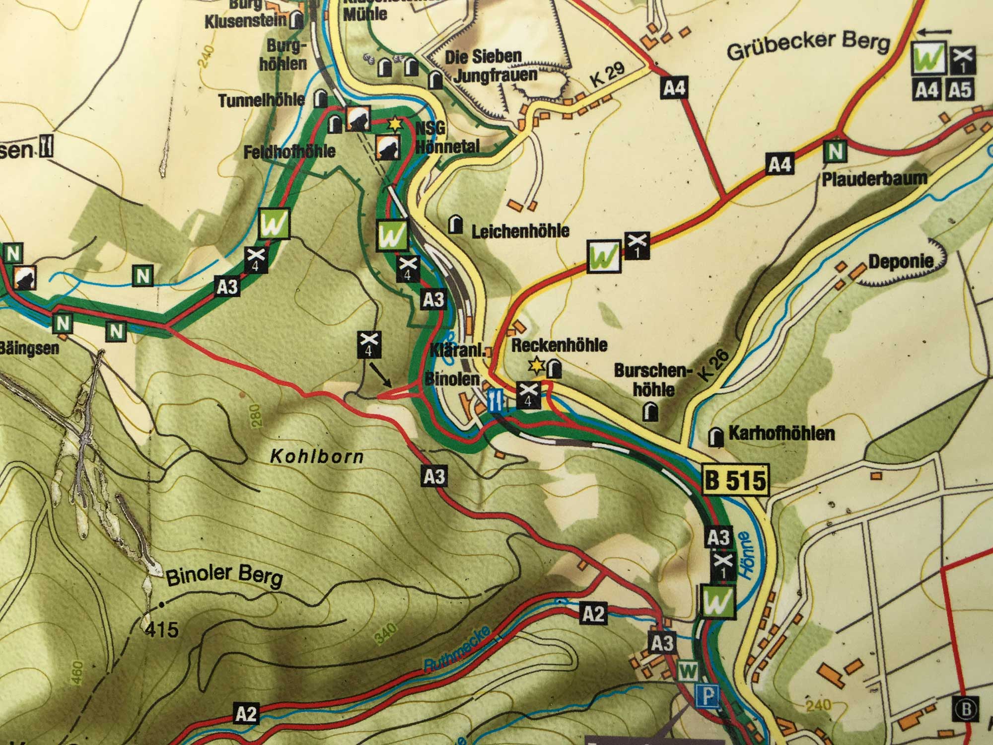 Am Bahnhof Binolen. Man kann aber auch ganz toll mit der Hönnetalbahn bis Binolen fahren. Es geht auch durch Tunnel! Meiner Enkelin gefällt das super! Am Bahnhof muss man so 50 Meter an der Straße entlang bis zum Haus Recke. Dort parken ist eigentlich nur für Gäste und Camper. Unter der Bahn hindurch und man ist schon an der Hönne. Manche fahren auch mit dem Auto dort entlang und parken direkt an der Schranke. Verpasst nicht nach so 100 Metern den kleinen Pfad unten an der Hönne entlang. Der ist nicht nur schön, sondern ihr schneidet dabei einen blöden Bogen ab. Noch ein Tipp für Kinder ist die Tropfsteinhöhle. Infos dazu gibt es im Haus Recke.