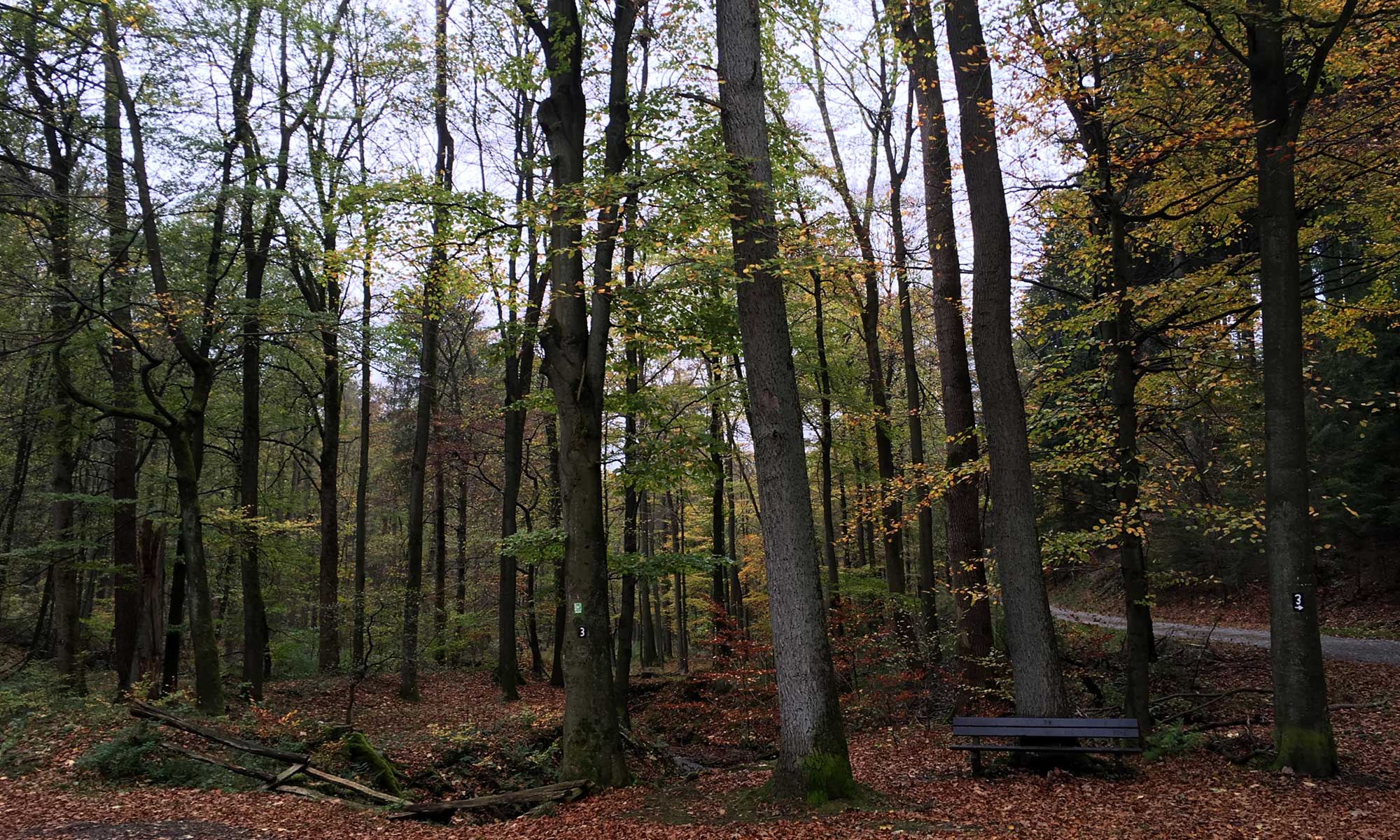 Der nächste Kilometer geht entspannt durch den Wald am Kamm der Hügel, bis wir zum Forsthaus Löhen und der Landstrasse hinunter steigen. Auf der anderen Strassenseite geht es weiter, und über einen Forstweg durch einen herbstlich bunten Mischwald.