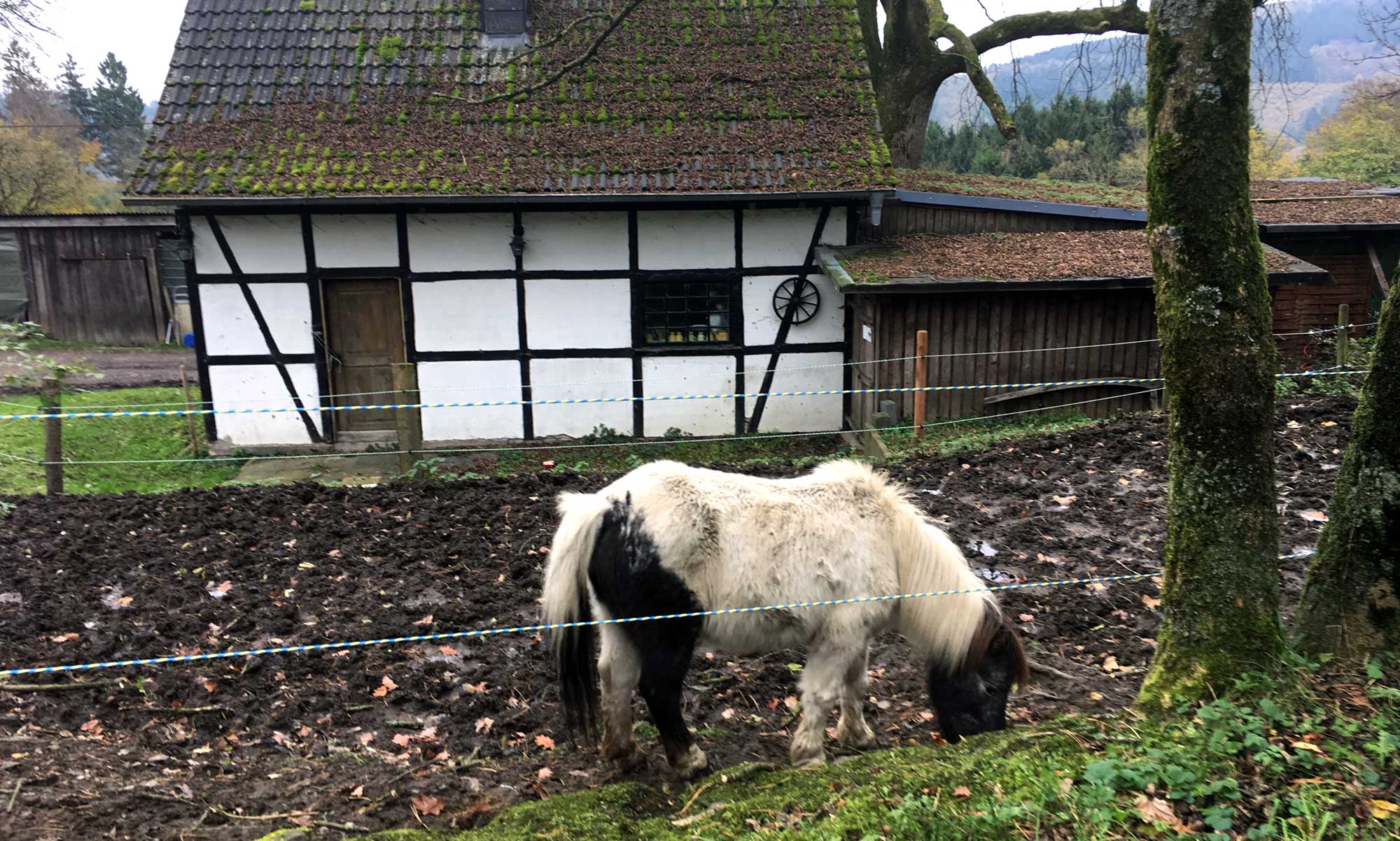 In Sülberg kommen wir an ein paar Ponys vorbei. Zeit für Fotos die bei diesen Sichtverhältnissen mehr zeigen als nur Grau.
