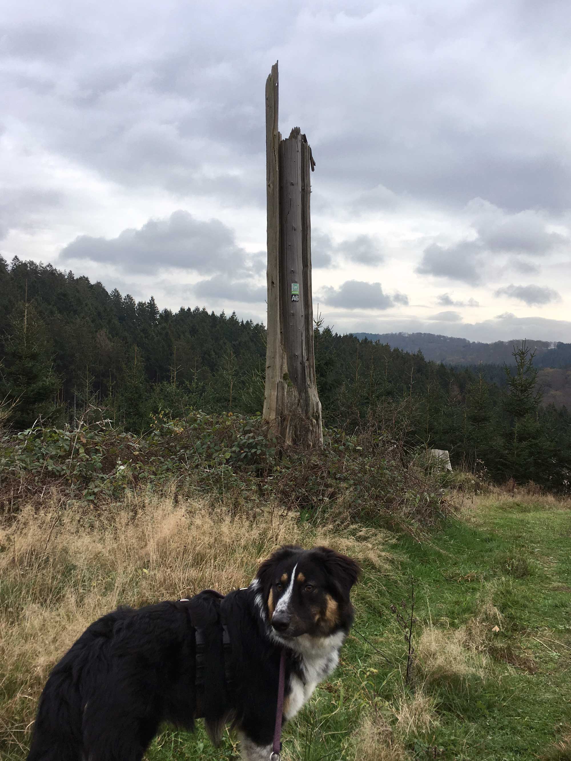 Der Anstieg nach Holmecke erweist sich als unschöner, richtig fieser Anstieg. Schnurgerade, breit und landschaftlich eher monoton, zieht sich der Forstweg über 1-2 Kilometer stetig in die Höhe. Keine Atempause, es sei denn Mozart bleibt für eine Schnüffelaktion stehen. Jetzt spüre ich meinen mit 6 Kilo bepackter Rucksack. Das Gewicht war Absicht und ist Teil meines Konditionstrainings für die geplante Tour durch Wales nächstes Jahr.