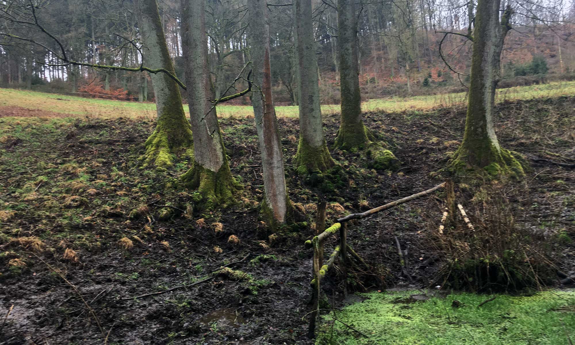 Oberhalb des Schützenhauses geht es wieder in den Wald auf einen schmalen Pfad durch Matsch und Wasser. Schön! Mir wird warm, ich ziehe die Daunenjacke aus und gehe nur mit der Softshell Jacke weiter.