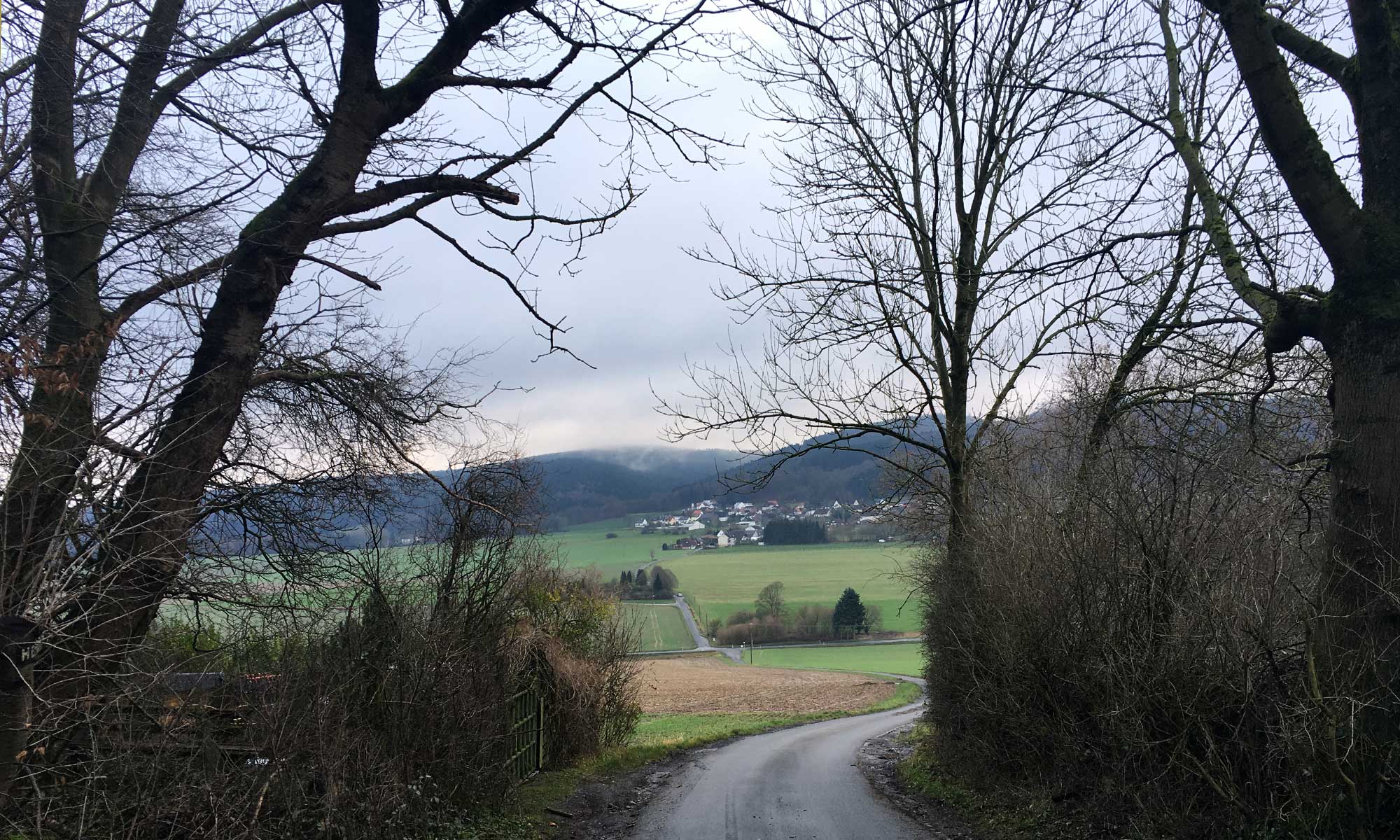 Am Ortsausgang von Riemke, das nur aus wenigen Häusern zu bestehen scheint, hat man einen Blick über das Tal hinüber nach Brockhausen.