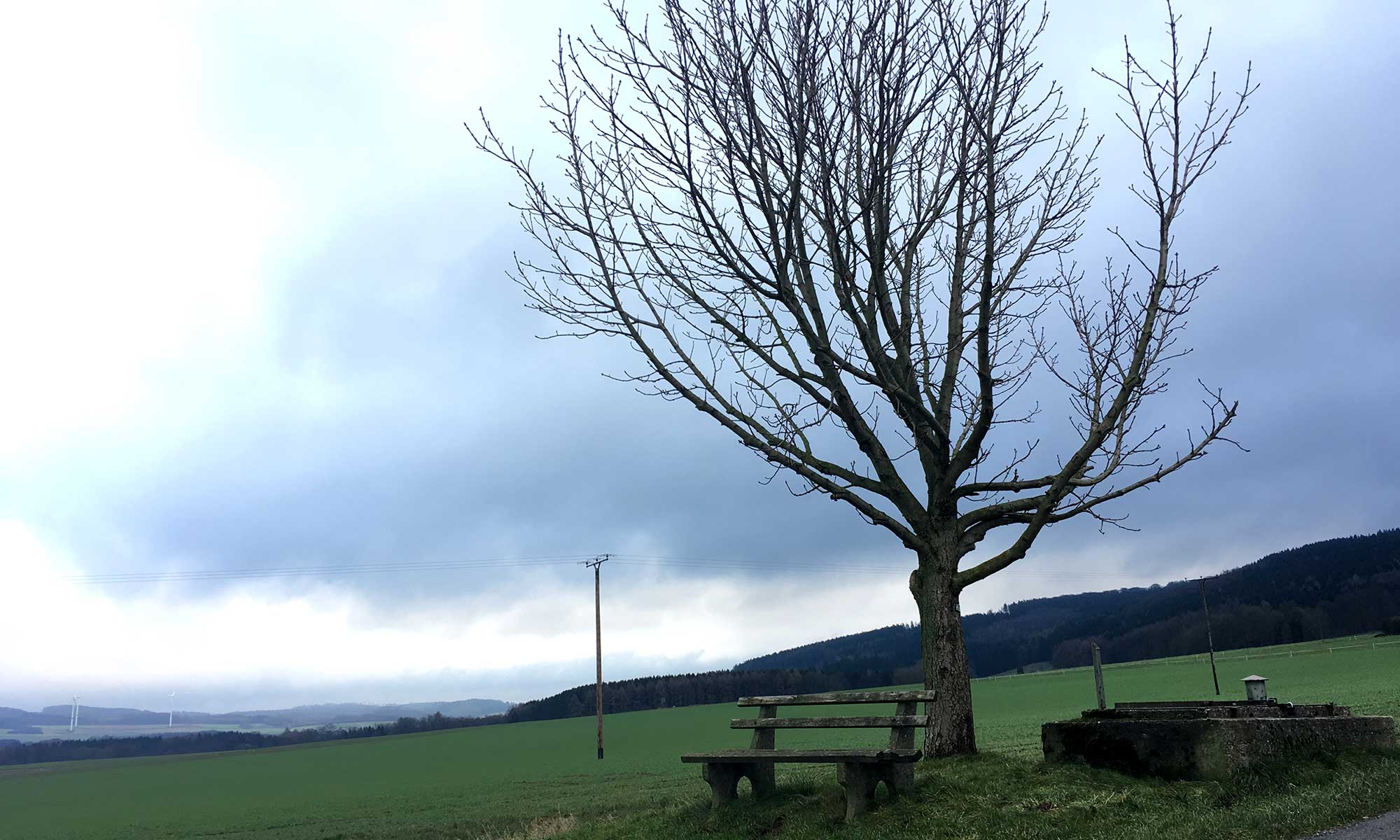 Panoramabilder sind heute nichts, aber in Brockhausen finde ich einige kleine Dinge am Wegesrand. Direkt am Ortseingang einen Baum und eine Bank.