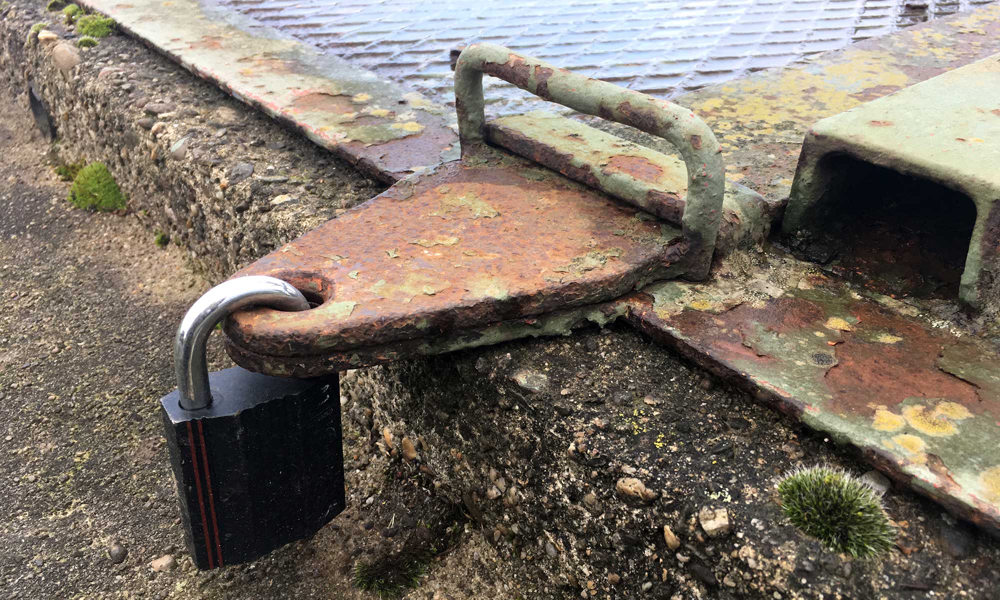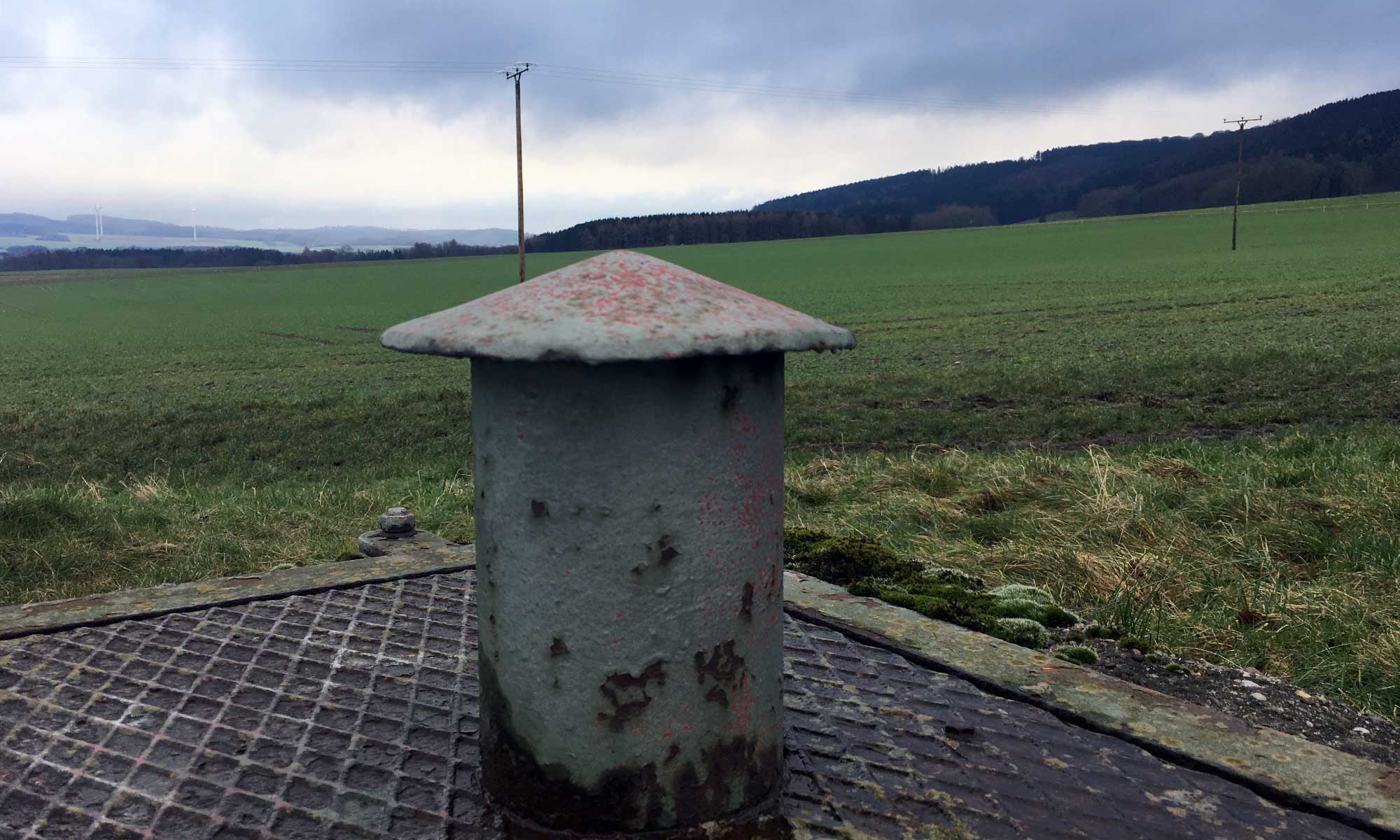 Hinter dem Baum ist irgendetwas mit einem Eisendeckel und Schloss abgedeckt. Mitten darauf ein kleines Türmchen: