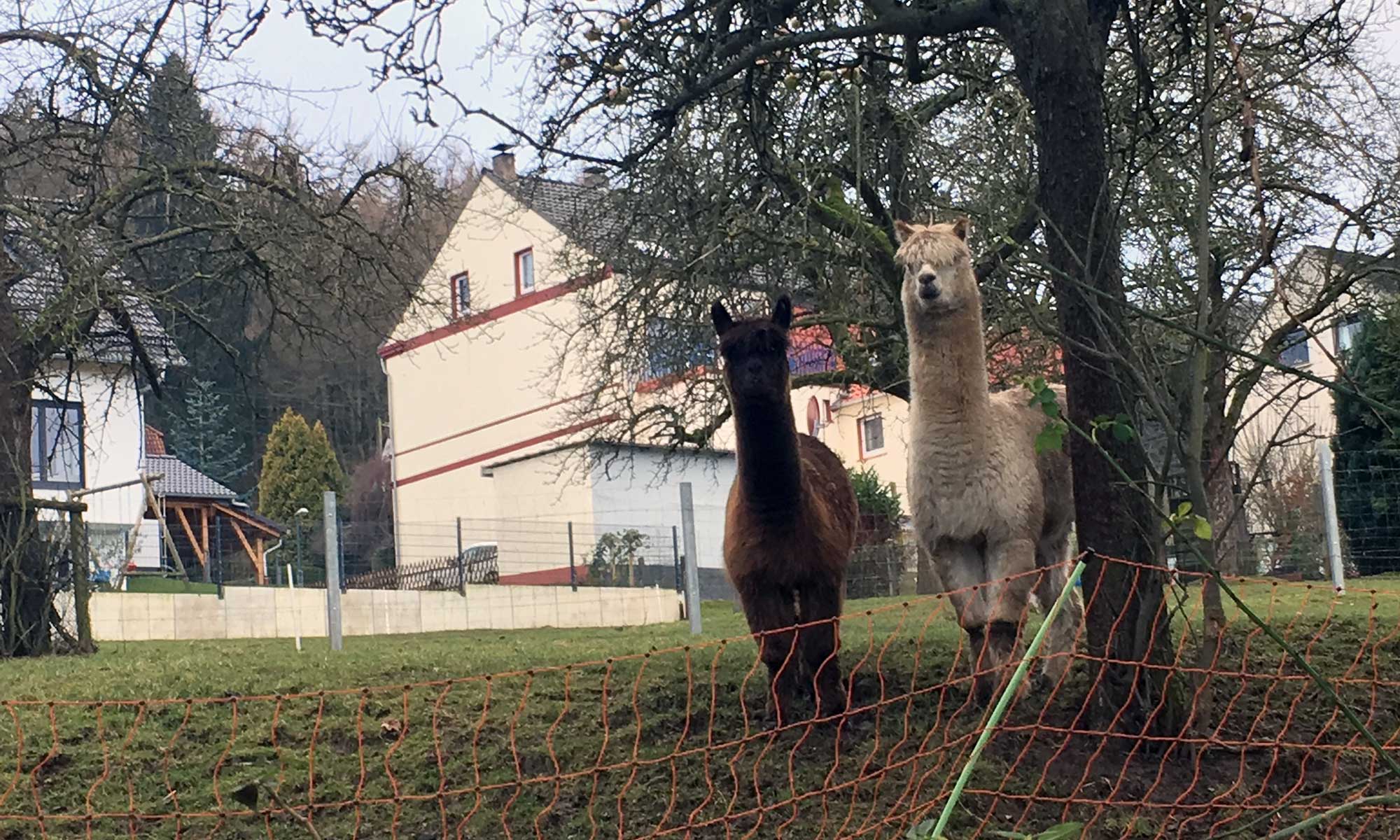 Und zu guter Letzt noch 2 kuschelige Alpacas, die uns neugierig betrachten. Mozart wie immer voll Interessiert.