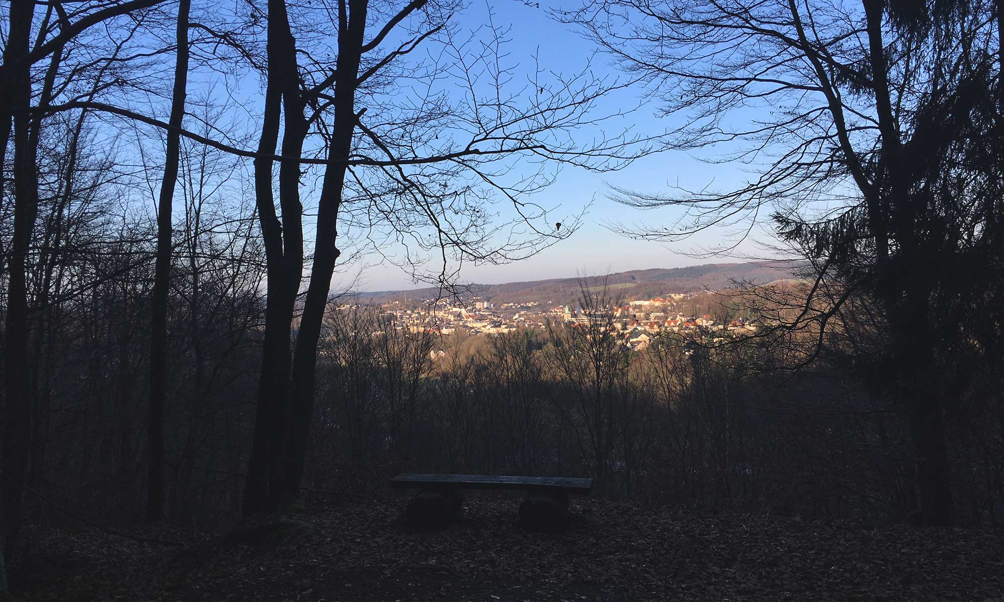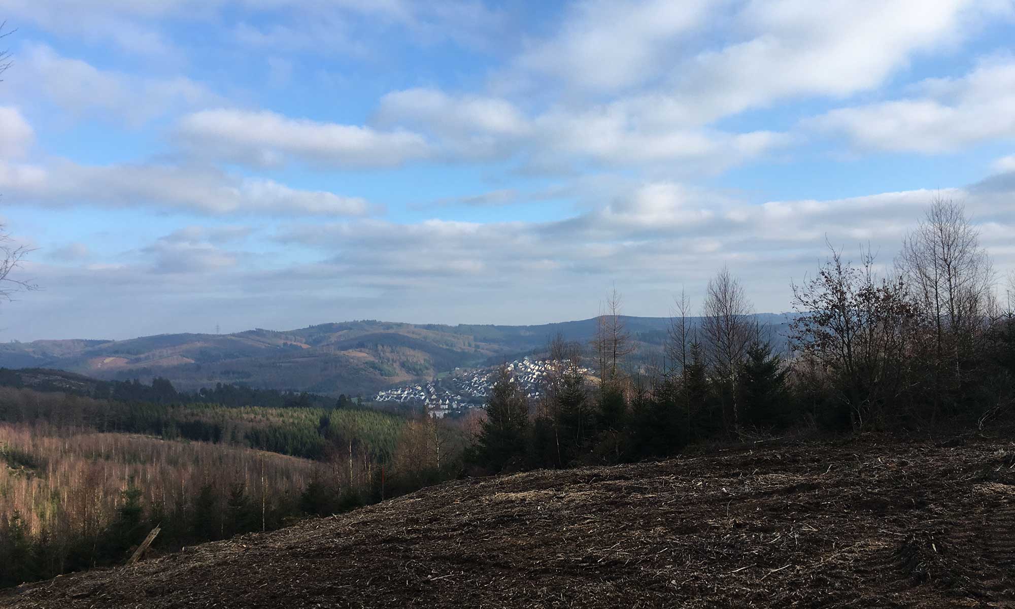 Das Wetter ist Bombe, es ist kalt und schwitzen ist heute eine Unbekannte.  Den ganzen Weg bis Sundern treffen wir immer wieder auf Kahlschläge, die Kyrill hier hinein gebohrt hat. Es ist enttäuschend, dass man hier immer wieder neue Tannenanpflanzungen sieht. Nach ungefähr einer Stunde erhaschen wir einen kurzen Blick auf unser erstes Ziel: Sundern.