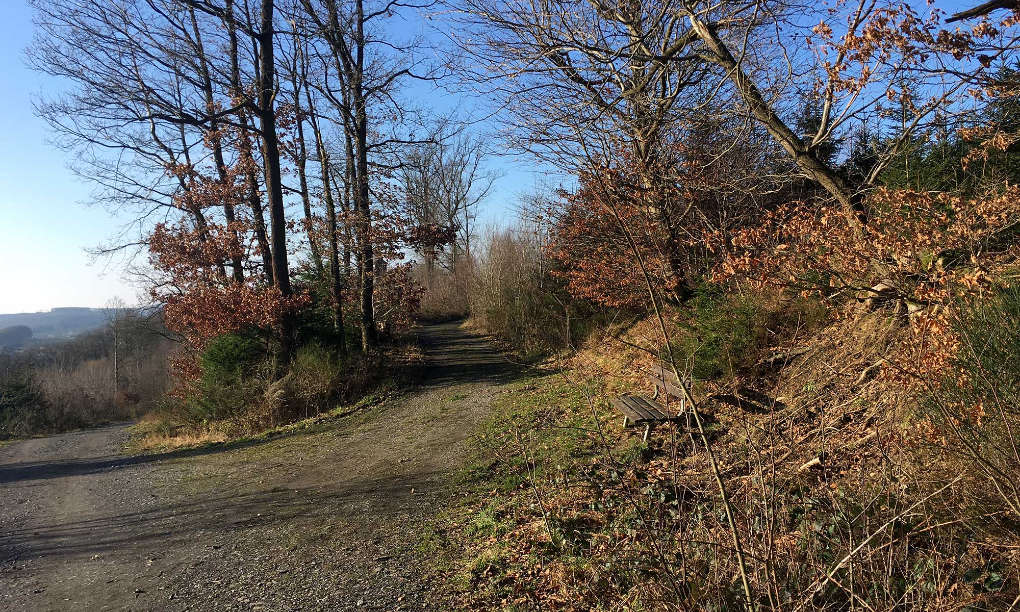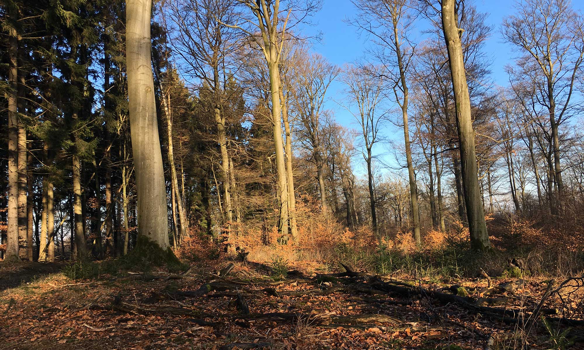 Der Wald hier ist wunderschön. Der Waldboden fast durchgängig bedeckt mit braun-roten Blättern. Die Sonne scheint durch die kahlen Äste und zaubert Lichtspiele auf den Waldboden, der im Sommer im Schatten der Bäume liegt.