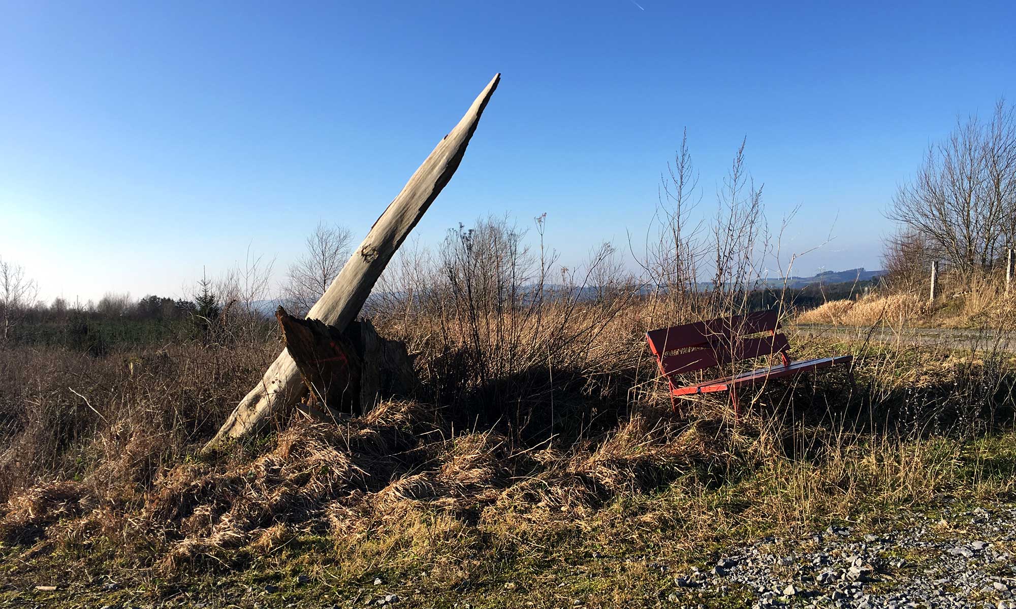 Doch der Weg ist wunderschön, blendet man die Plantagen mal aus. An irgendeinem Punkt kommen wir an einer Bank vorbei, und wie ein Mahnmal stützt sich dahinter ein abgestorbener Tannenstumpf wie ein Finger in die Höhe. Die Aussicht hier ist Atemberaubend, es scheint der höchste Punkt zu sein, den wir heute erreichen.