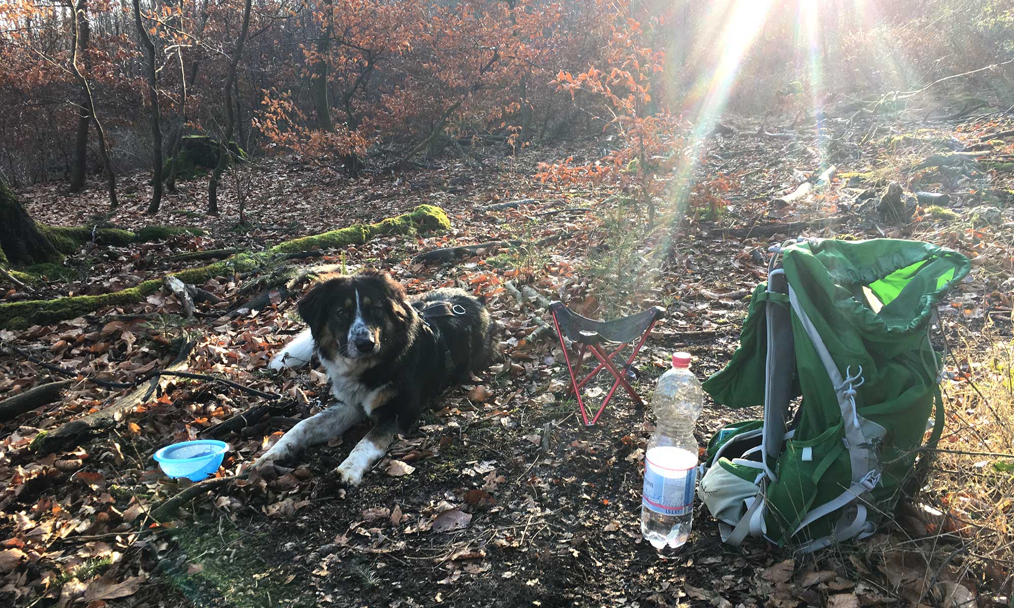 Ich bin wie verzaubert und merke meine Füße nicht mehr, die an den Ballen immer wieder schmerzen. Wir gehen wie in einem Traum über die weiche Blätterdecke durch ein Märchen.  Zeit für eine kleine Pause in der Sonne auf einer Lichtung. Mein Höckerchen ist ein zusammenklappbares Dreibein von Robens. Im Herbst und Frühling mein Sitzplatz vor dem Zelt, um der Bodenkälte zu entkommen. Beim Wandern im Winter mein Begleiter. Wiegt nur ein paar 260 Gramm.