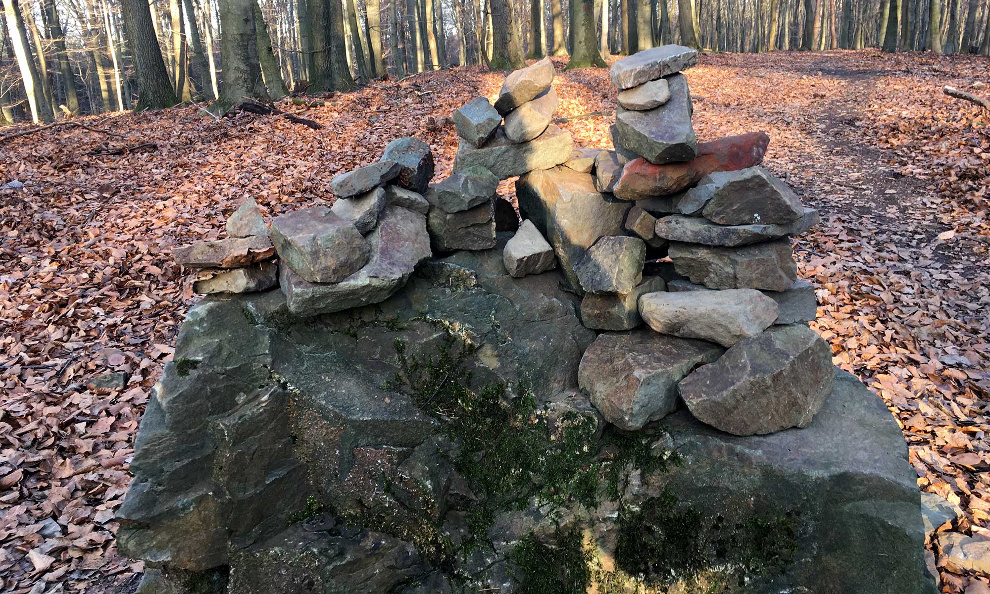 So lange waren wir noch nie unterwegs, und die Füße und Pfoten tragen uns weiter, als ob wir noch bis in die Nacht und darüber hinaus gehen könnten. Die Umgebung trägt einen großen Beitrag zu diesem Gefühl bei. Auch ich lege einen Stein auf das Gebilde unten im Bild und fühle mich eins mit dem Universum. Mit jedem Schritt befreie ich mich ein Stück mehr von irgendeinem Mist in meinem Kopf. Ich gehe zu mir.