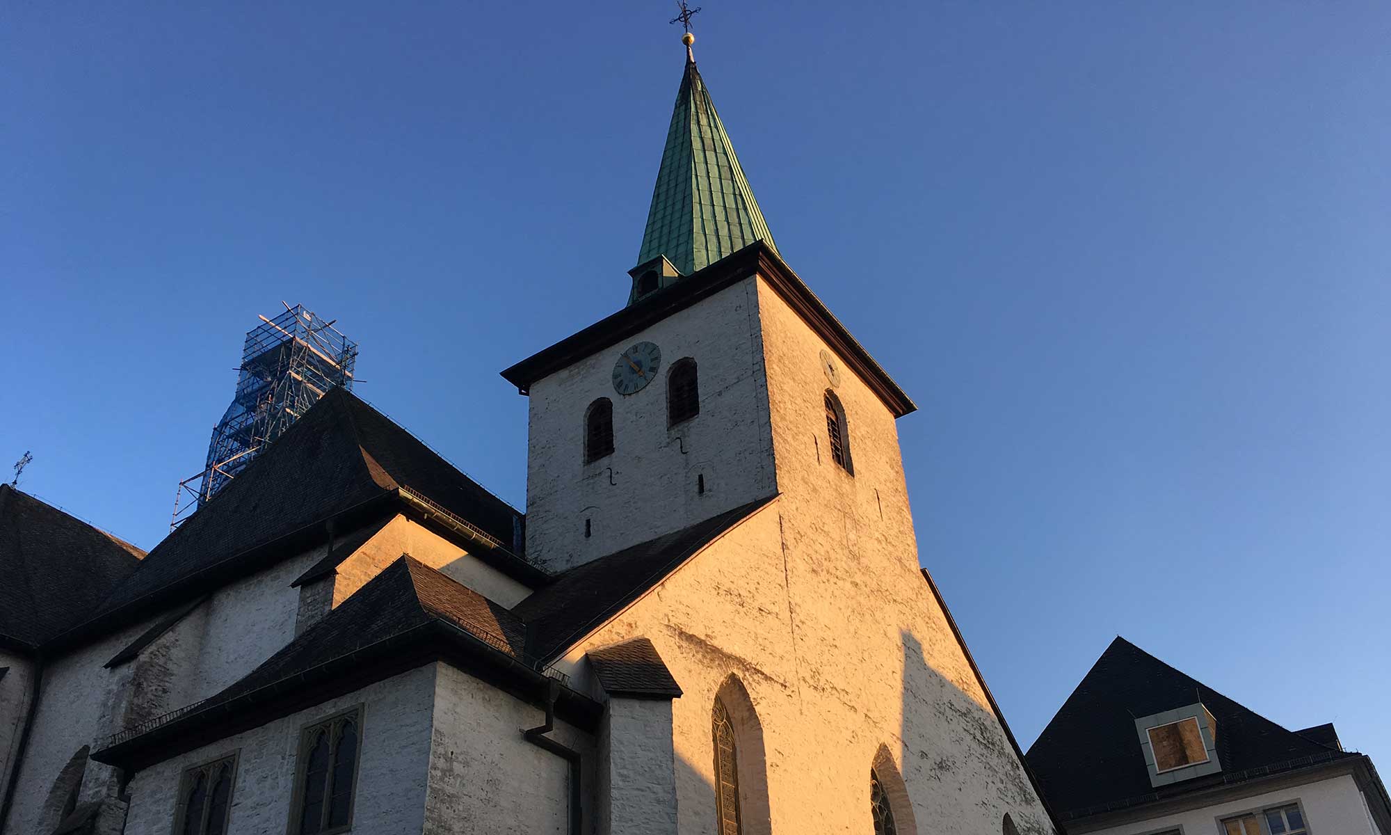 Es geht am Kloster Wedinghausen vorbei über die Ruhr und hinein in die Stadt. Die letzen Meter bis zum Bahnhof scheinen endlos, denn wir gehen eine breite, unromantische Strasse immer geradeaus entlang an öden Geschäften, bis, bis endlich im Hintergrund das weiße Bahnhof Gebäude auftaucht.