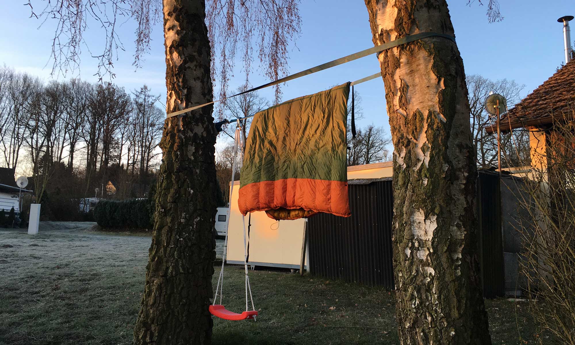 Mein Quilt von Enlightened Equipment hat wieder einmal warm gehalten. Unglaublich, an das Nicht-Gewicht auf meinem Körper werde ich mich noch gewöhnen müssen. Mozart habe ich in der Nacht auch davon überzeugen können unter meine warme Decke zu schlupfen, und so lagen wir am Morgen eng umschlungen in meinem winzigen Zelt. Leider hatte das Innenzelt viel Kondenswasser, aber wundert es mich? So dicht am Wasser? Beim Aufrichten wurde leider mein Quilt ein wenig feucht, und zum Trocknen auf die Leine gehängt.