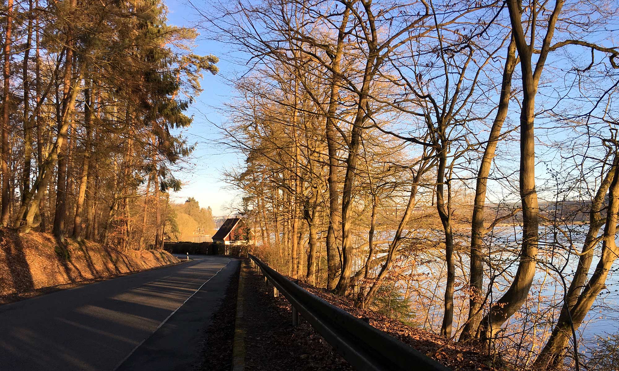 Im Bus sind wir die einzigen Fahrgäste, steigen am Campingplatz Delecke Süd aus, geben den Schlüssel zurück und los geht es zurück auf die Waldroute. Diese verläuft oberhalb des Südufers und ist ein Teil des Rennweges. Der erste Kilometer ist auch Teil des Klangwaldes. Man sollte aber bei Wind den Klangwald besuchen. Heute ist es windstill, die Sonne scheint, es ist einfach ein wunderschöner Tag mit strahlend blauem Himmel.