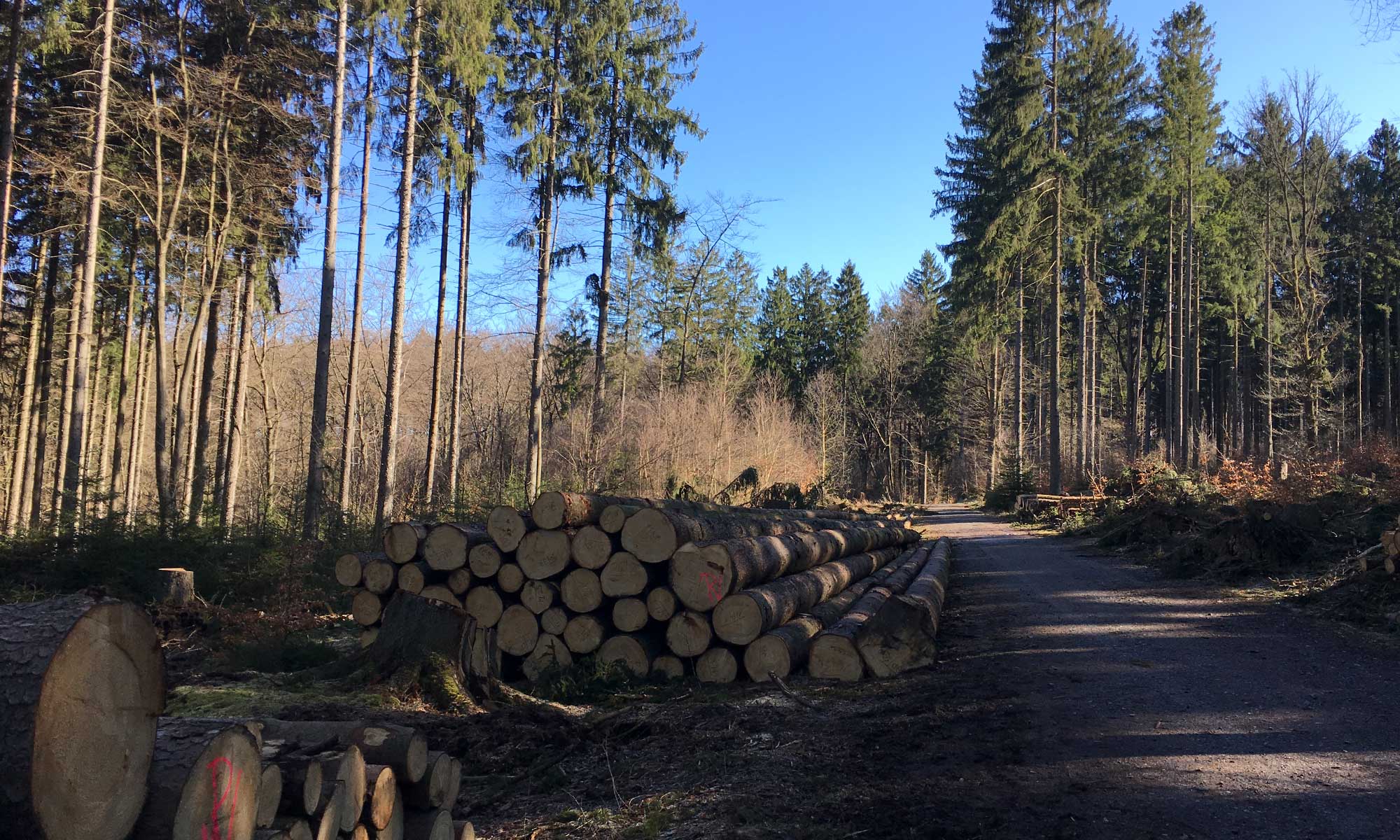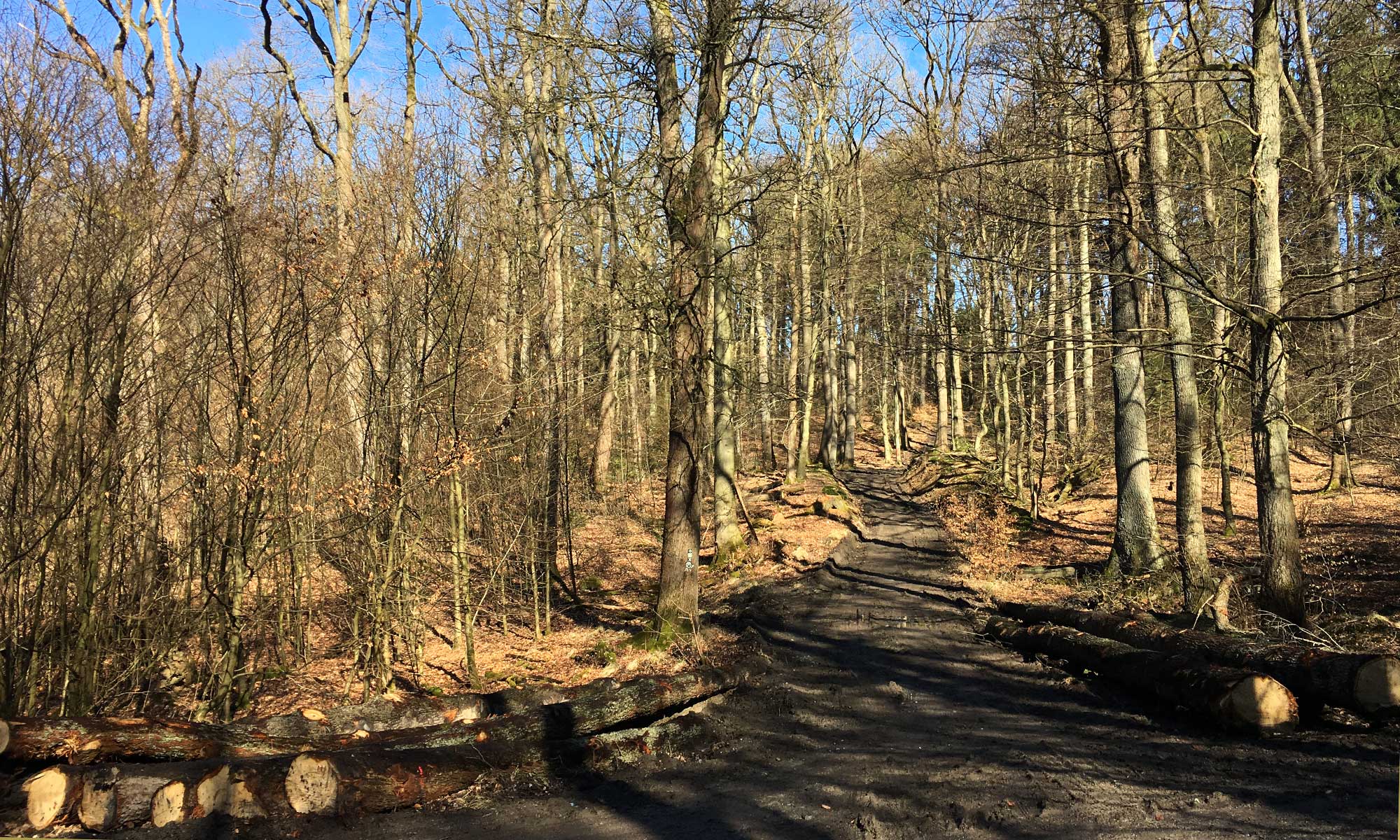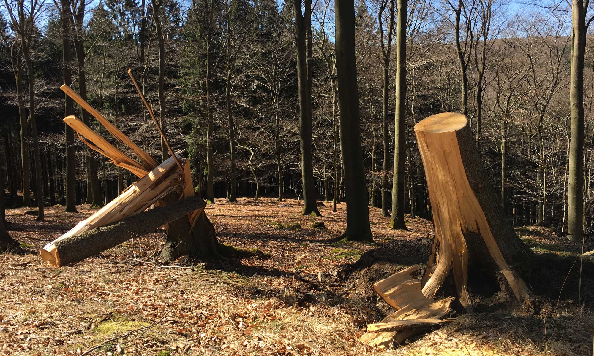 An anderen Stellen stehen die Erinnerungen an den Sturm Frederike wie Skulpturen am Wegesrand.