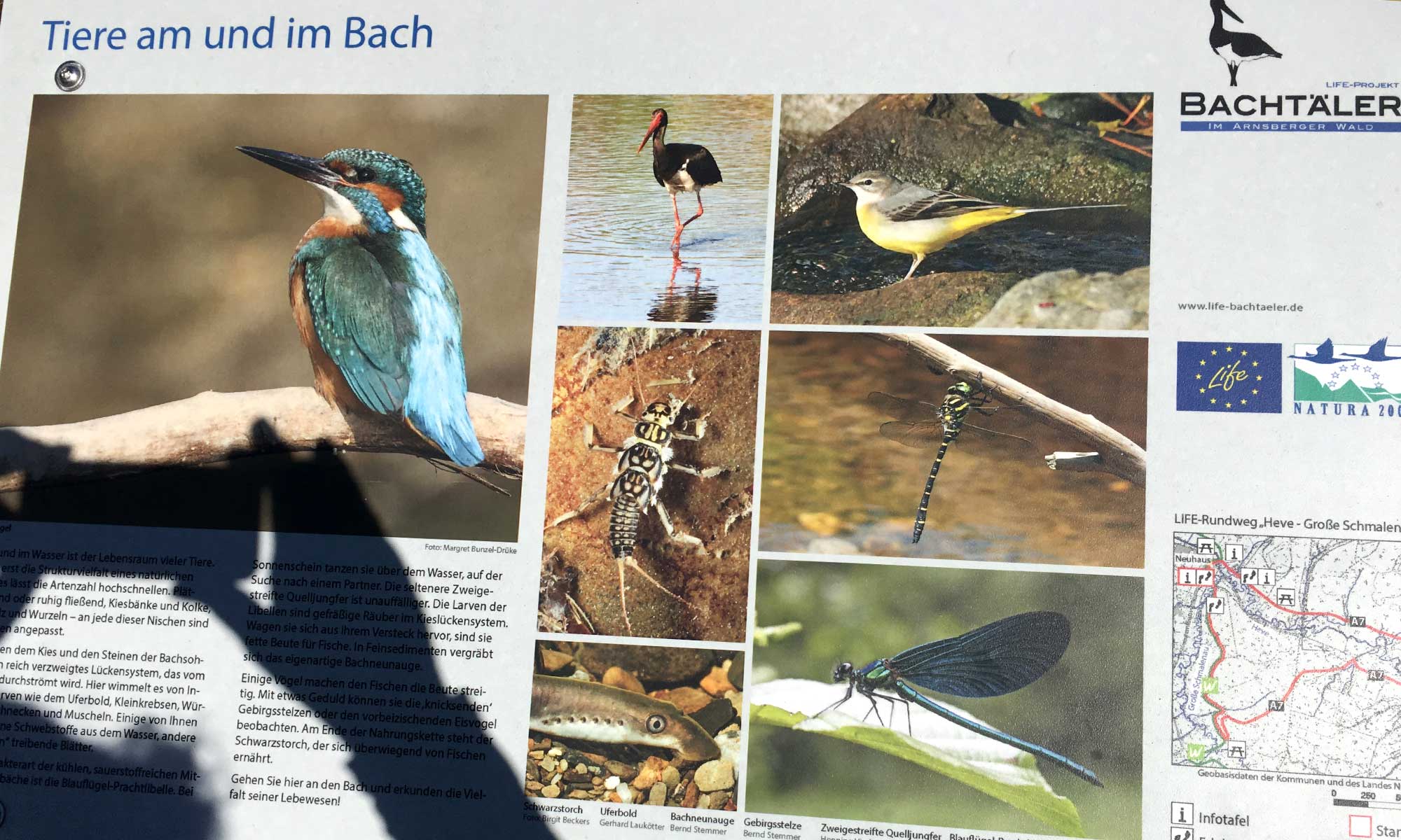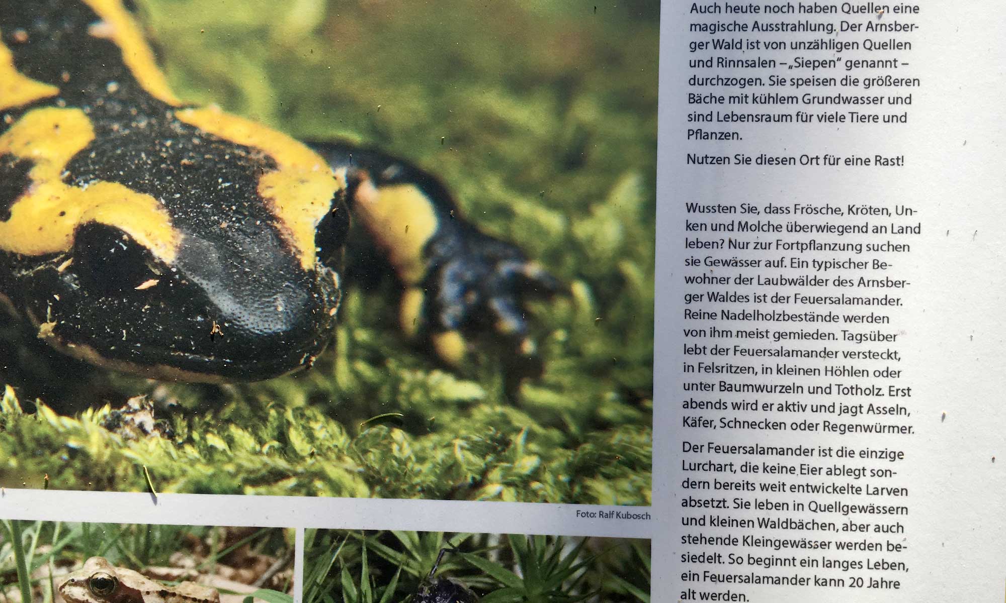 Dieses Bild zeigt eigentlich alles was wir heute gesehen haben in einem Bild. Wasser, Licht und Wald. Eine Tafel weist auf die Quelle hin und auf die Salamander, die hier heimisch sind. Es lohnt sich den Text auf der folgenden Tafel zu lesen!