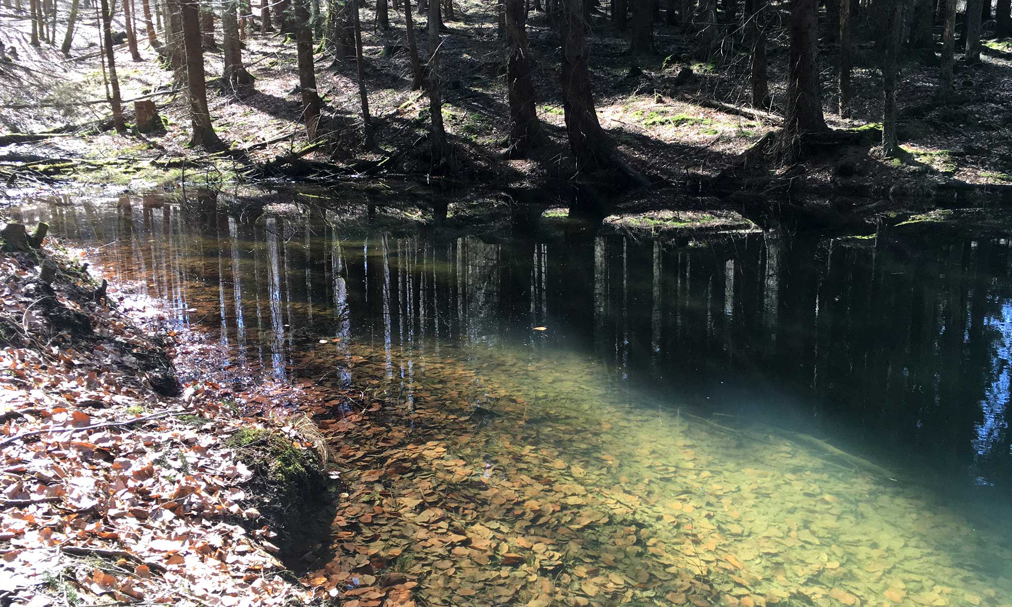 Eigentlich geht es die ganze Zeit leicht bergauf, man merkt es nur kaum, so schön ist der Weg! Der Dinkelweg ist wieder ein breiterer Forstweg, der wieder in ein Tal hinaufführt, durch das ein Bach fließt. Nach etwa 1 km bleibe ich verzaubert stehen. Ein Teich, nein eine Quelle! Fehlen nur noch die Feen und Kobolde!