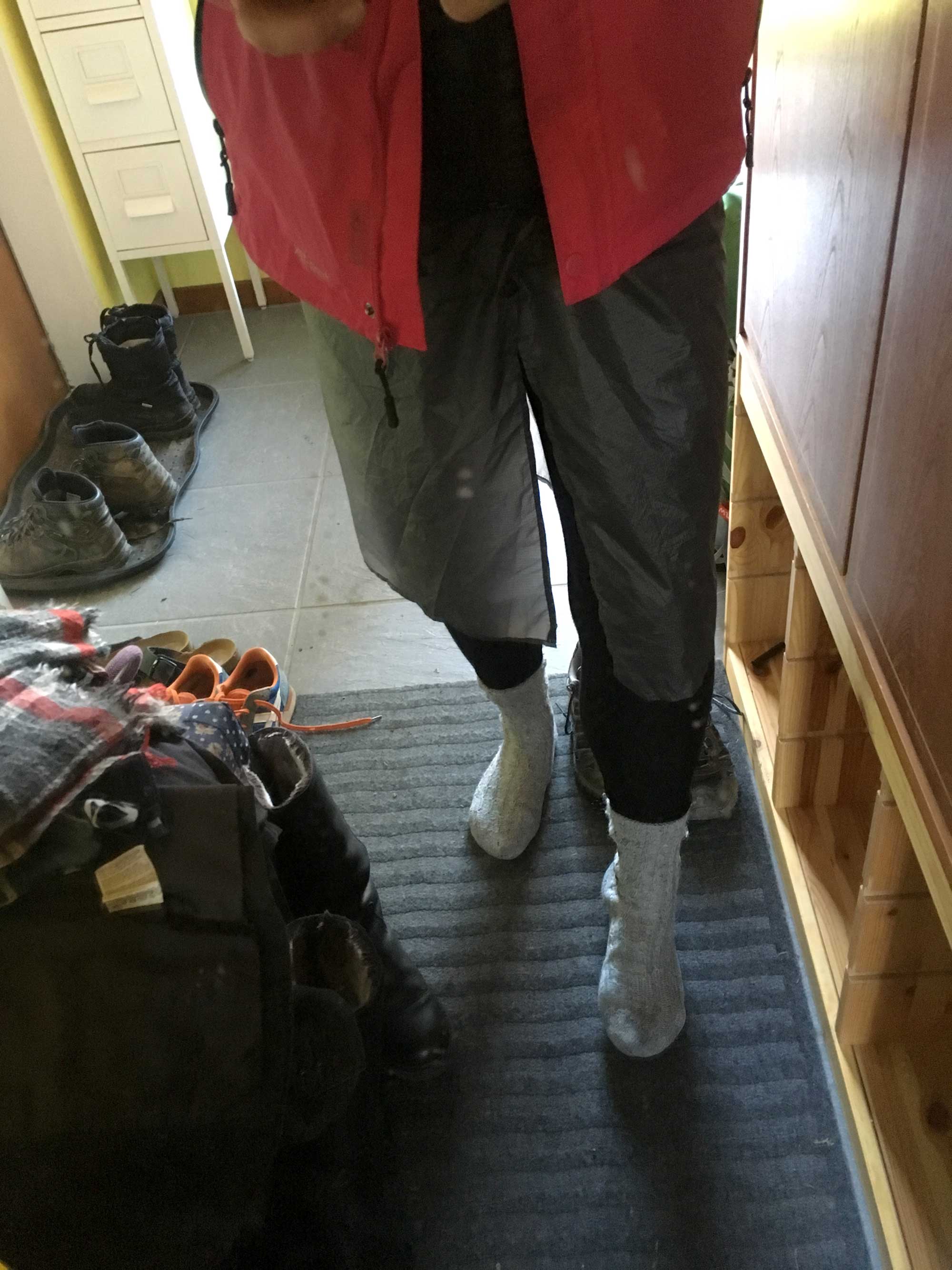 Ich verrate hier nicht wie es passiert ist, nur dass es passiert ist. Meine Wanderhose war pitschnass, meine Unterhose auch. Und nun? Meine Tochter anrufen und abholen lassen? Nein, ich gebe nicht auf, ziehe meine lange Wollunterhose wieder an, und da die sehr durchscheinend ist, ziehe ich meinen Regenrock von Enlightened Equipment darüber an. Ist mir sowas von egal wie ich rumlaufe! Ein Bild davon habe ich bei meiner Rückkehr gemacht, es wird am Ende dieses Beitrages zu sehen sein.