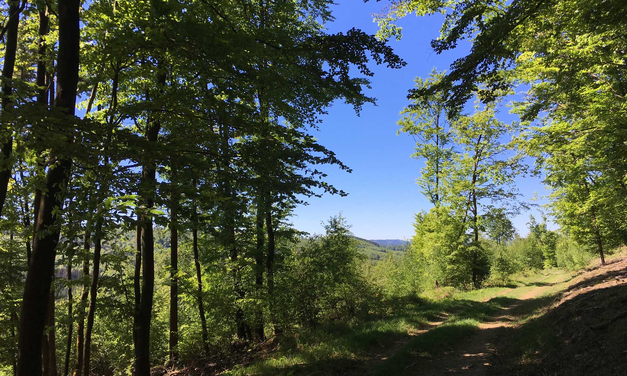 Wir folgen der Strasse durch Lattenberg bergauf, überqueren die Landstrasse und den Wanderparkplatz und es geht tief hinein in den Arnsberger Wald, der uns erfrischenden Schatten und angenehme Temperaturen bietet. Ab und zu öffnet sich der Wald und wir können über die Täler hinweg blicken.