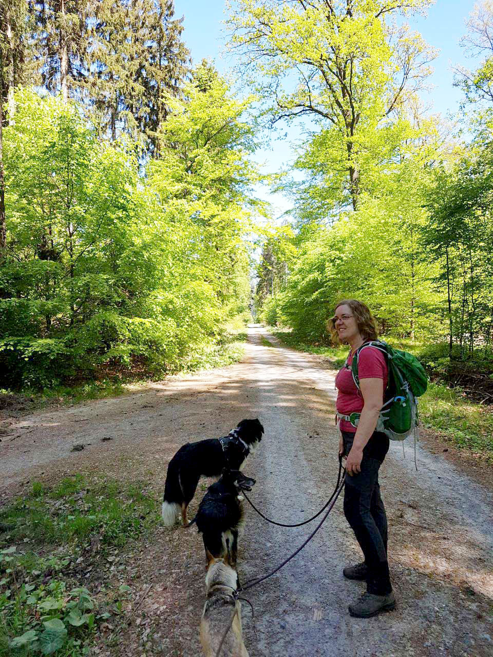 Der Weg heißt nun Knickerweg, und es geht nach Norden Richtung Hirschberg. Und da Elke dabei ist, gibt es auch von mir und meinen Hunden ein Wander – Foto.