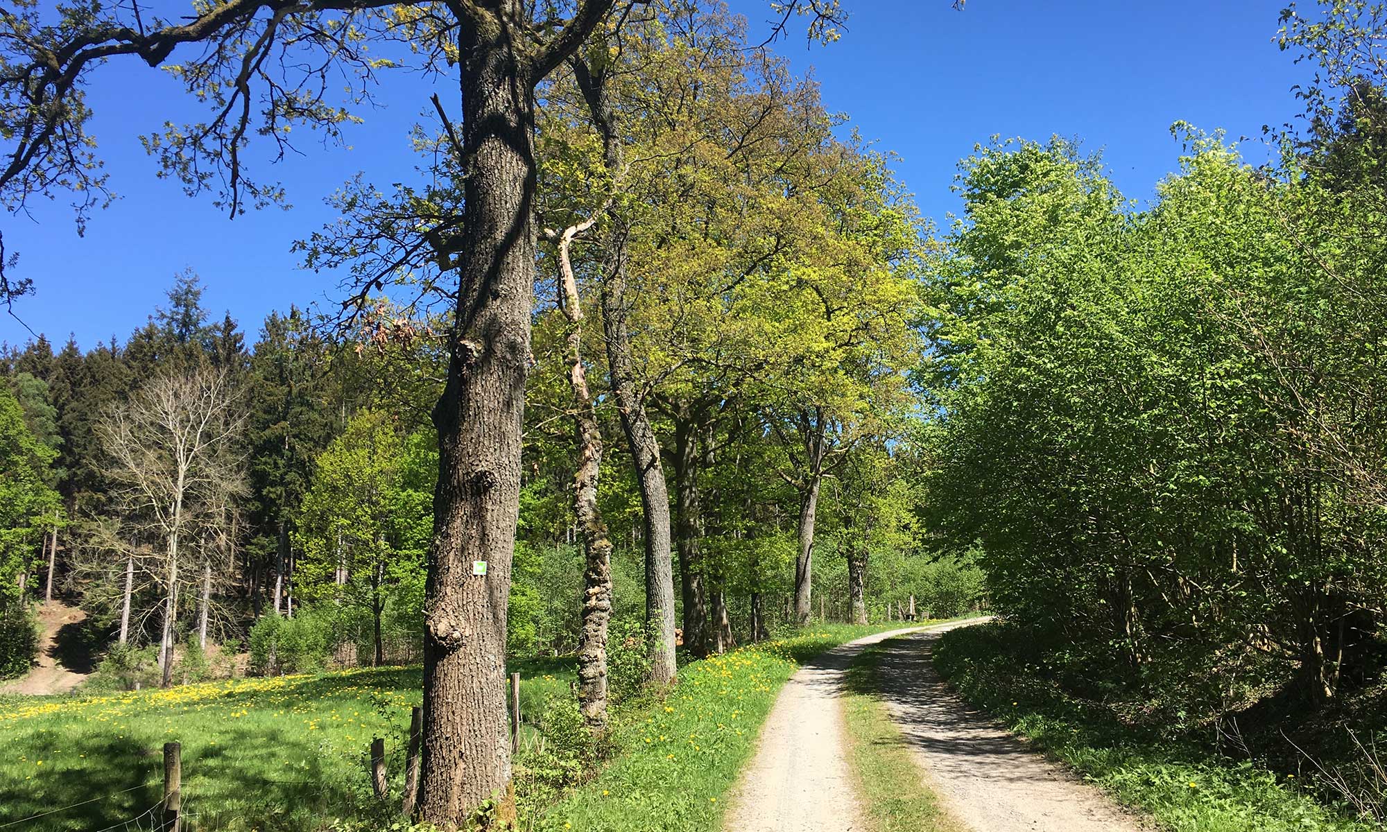 Von nun an geht der Weg immer am, oder nahe am Waldrand entlang. Man hat immer wieder diesen Zauberblick auf Hirschberg.