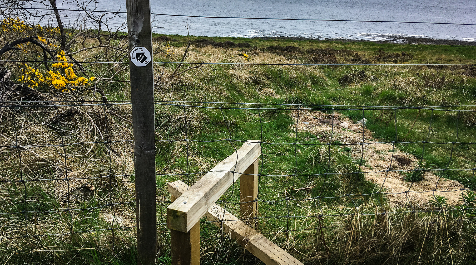 Nach der Brücke kommt der erste Zaun, mit der John o’Groats Trail Wegemarkierung;. Wir müssen drüber. Kein Tor, keine Lücke – nur klettern. Danach machen wir eine kurze Pause. Durchatmen nach der aufregenden Brücke. Aufstehen. Weiter.