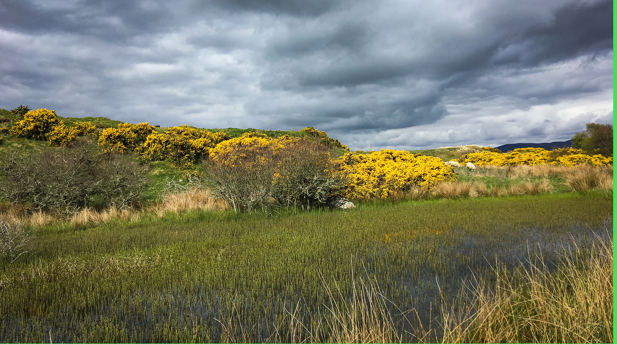 Plötzlich liegt die Landschaft weit vor uns: flache Tümpel, mit Gras überwuchert, Ginsterinseln, und darüber ein unglaublicher Himmel.