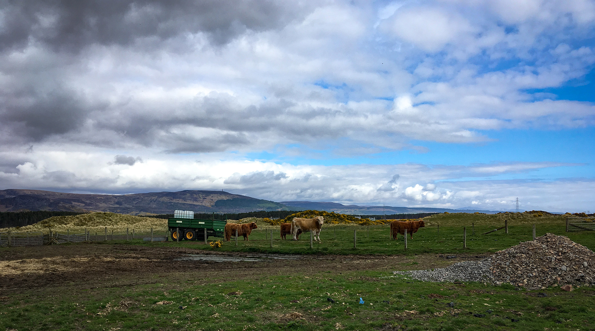Kurz bevor wir die schmale Straße nach Skelbo Castle erreichen Vorsicht, denn dort könnten Kühe auf den Weiden stehen.