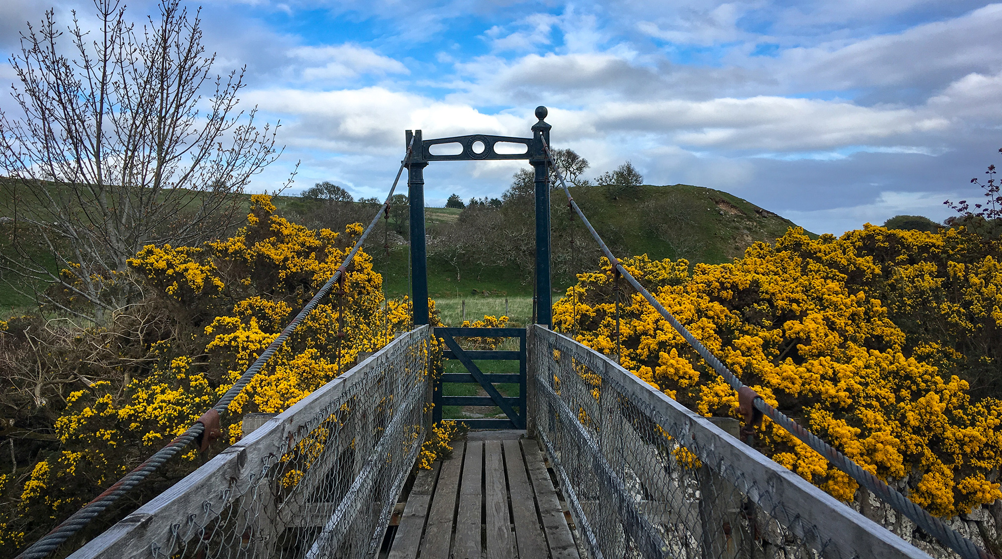 Vor uns spannt sich eine schmale Hängebrücke