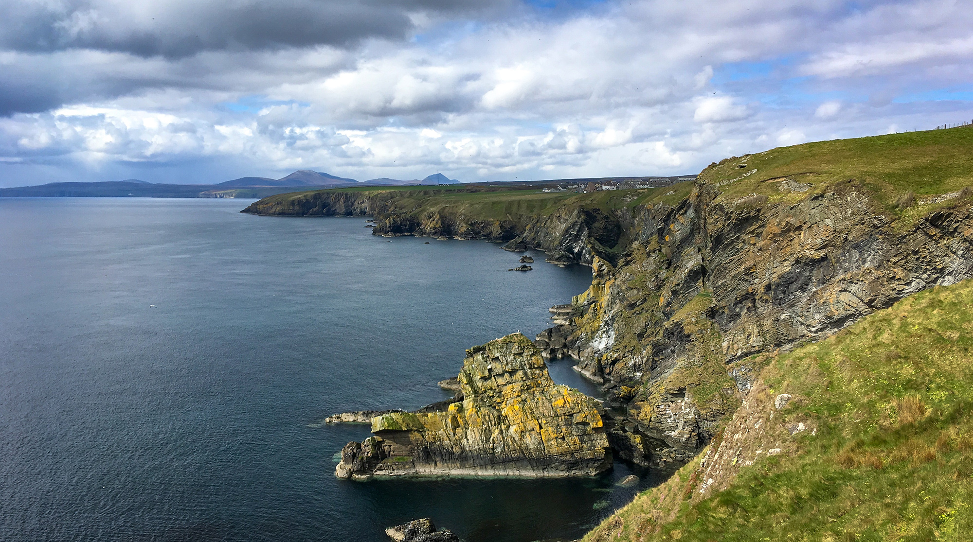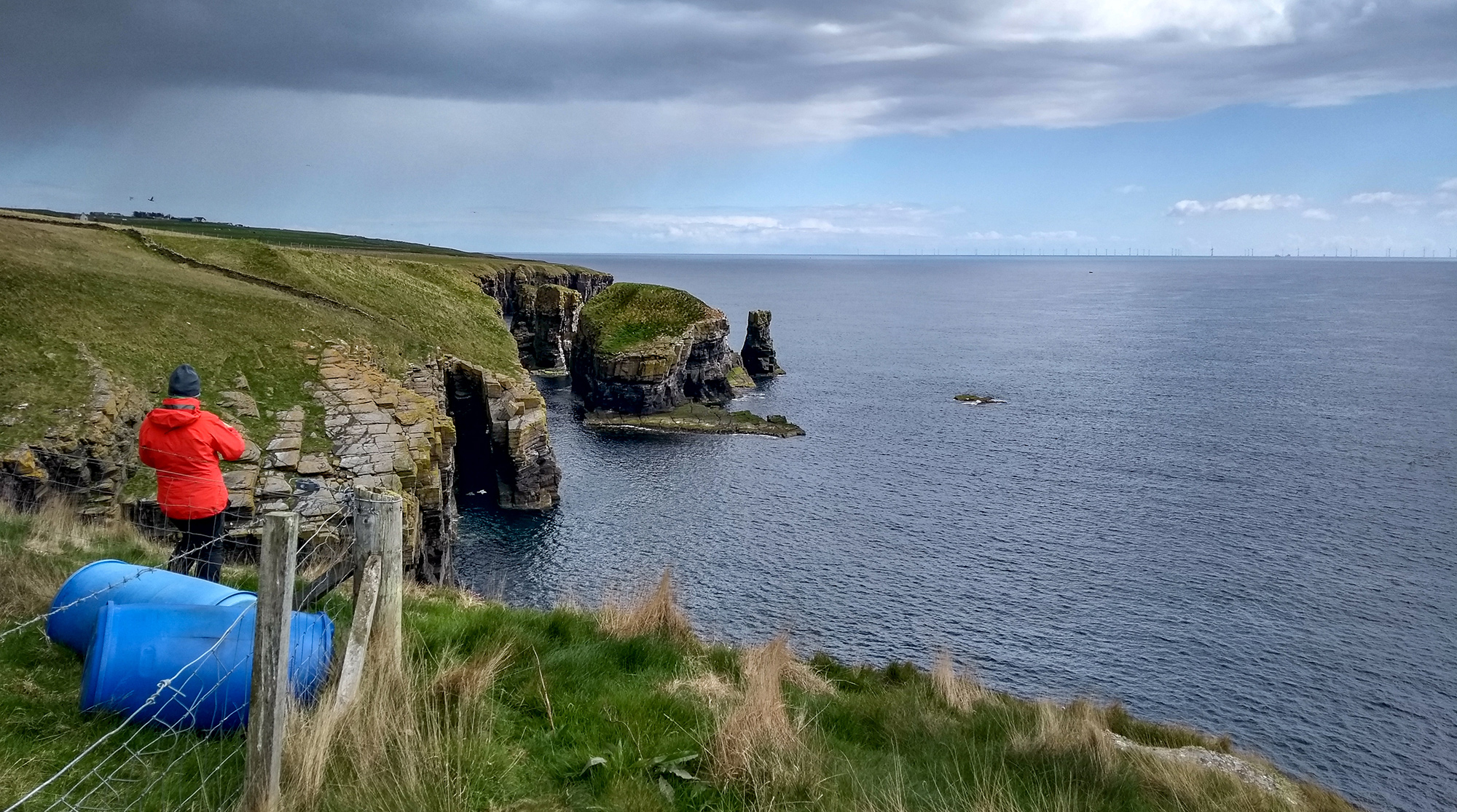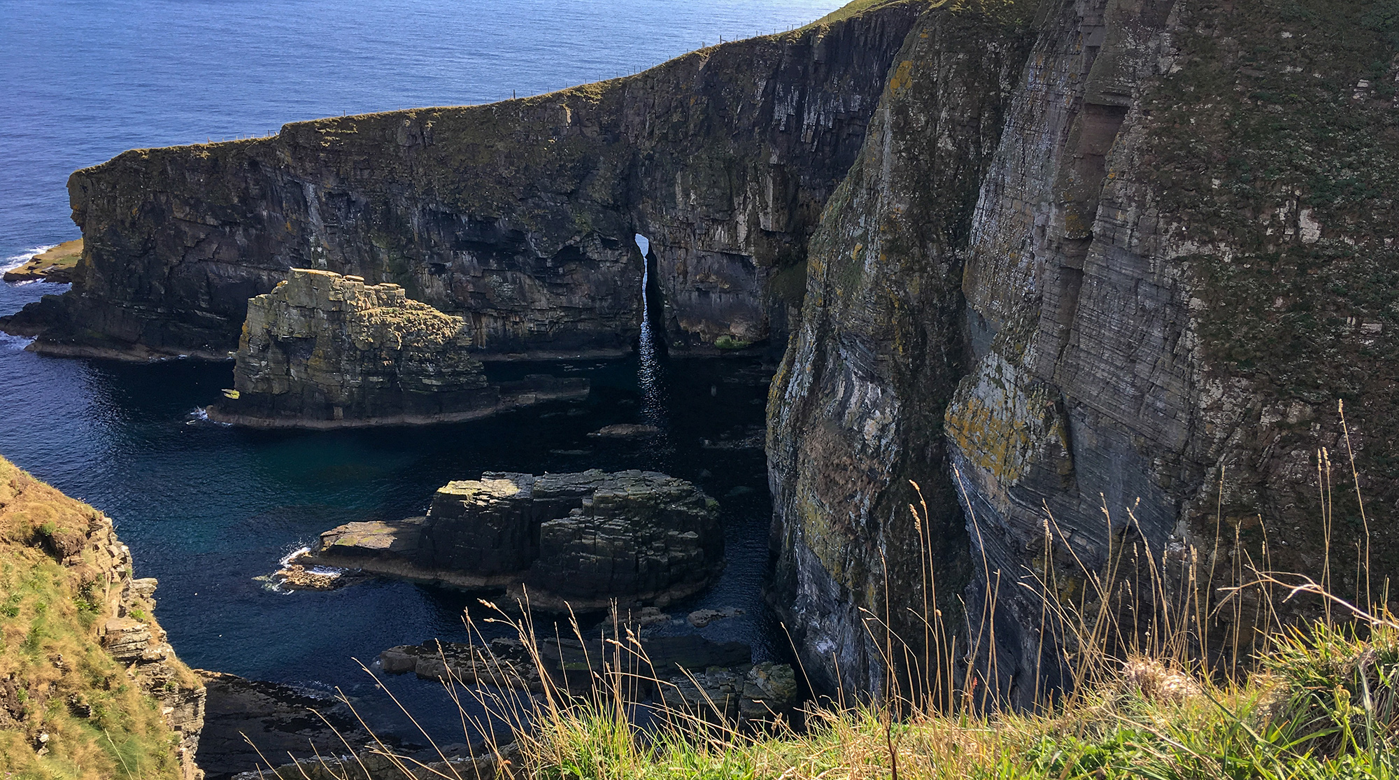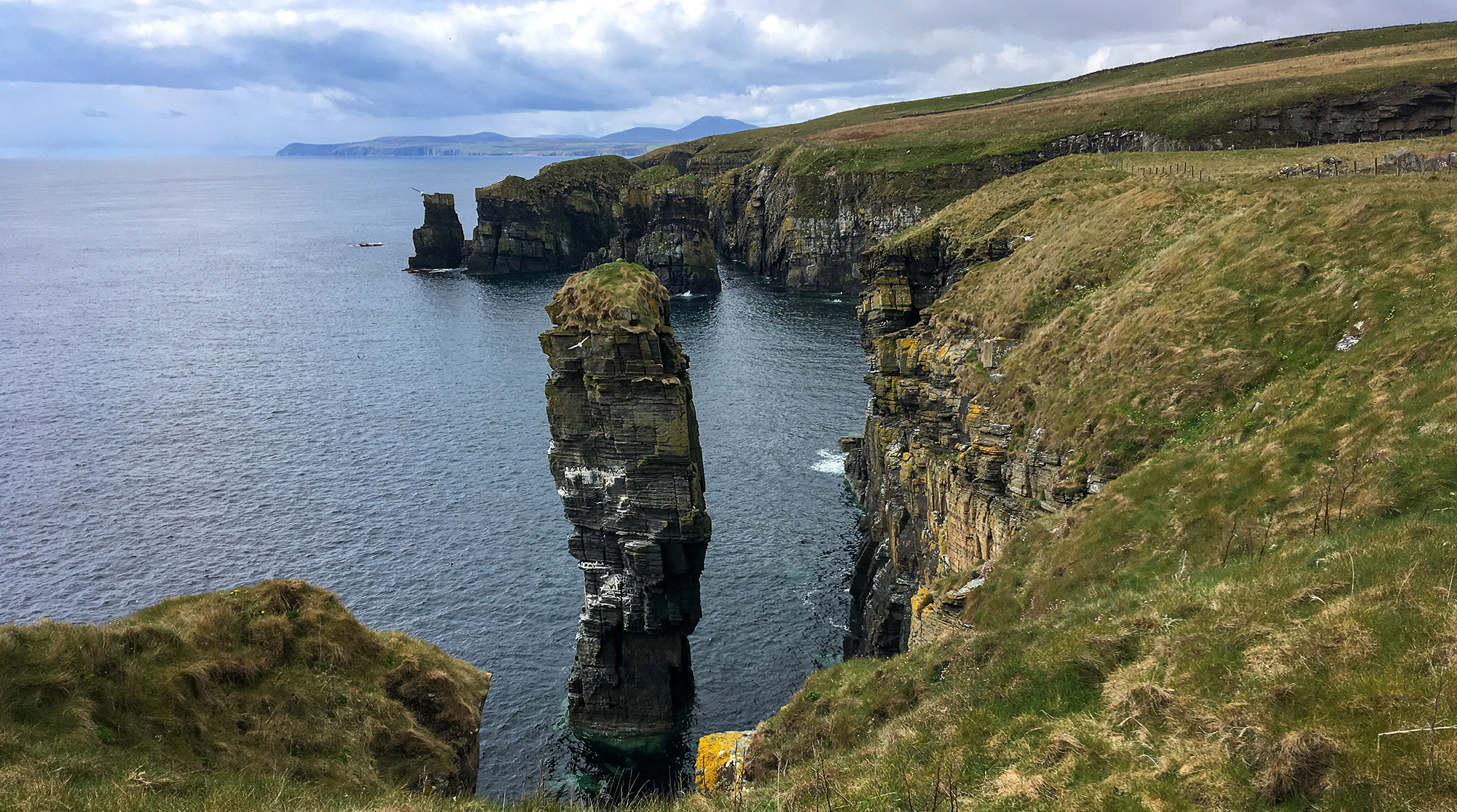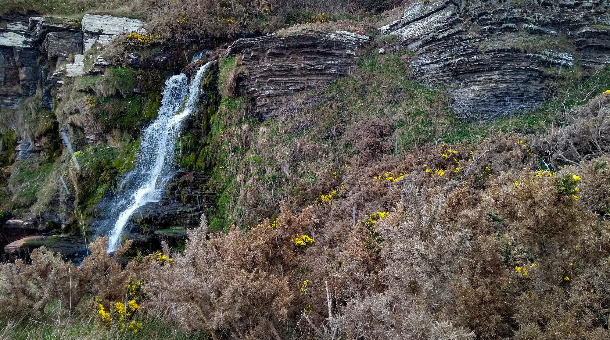 Ein paar Kilometer durch offene Heidelandschaft folgen, bis der Weg landeinwärts bei Occumster an einem Wasserfall vorbeiführt. Kurz darauf: die ersten Stacks – imposant, eindrucksvoll, ein Blickfang.