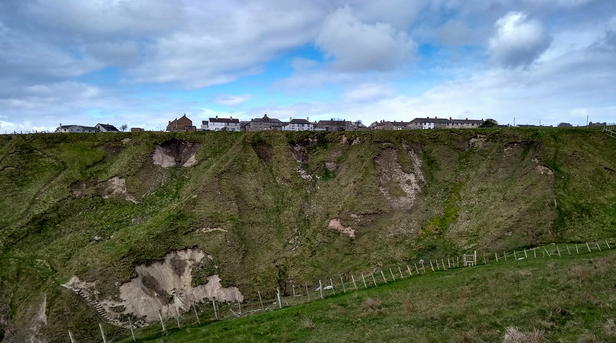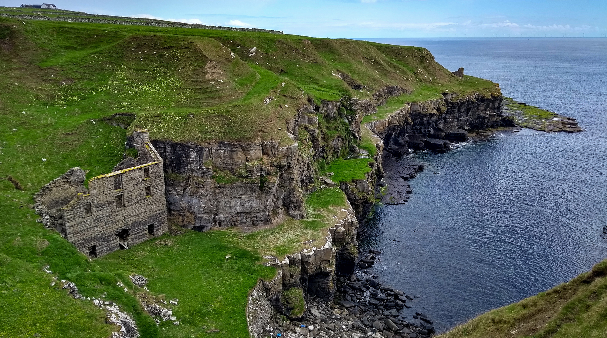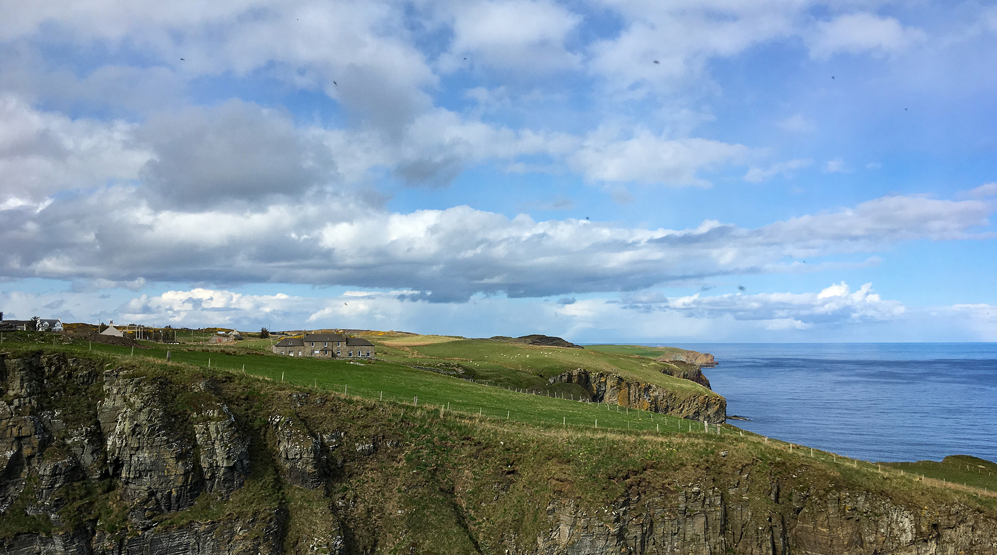 Weiter geht es hinunter zu einem kleinen Bach, dann wieder hinauf auf einen breiten, offenen Küstenrücken – ohne Farmland, mit den verlassenen Mains of Ulbster im Blick.