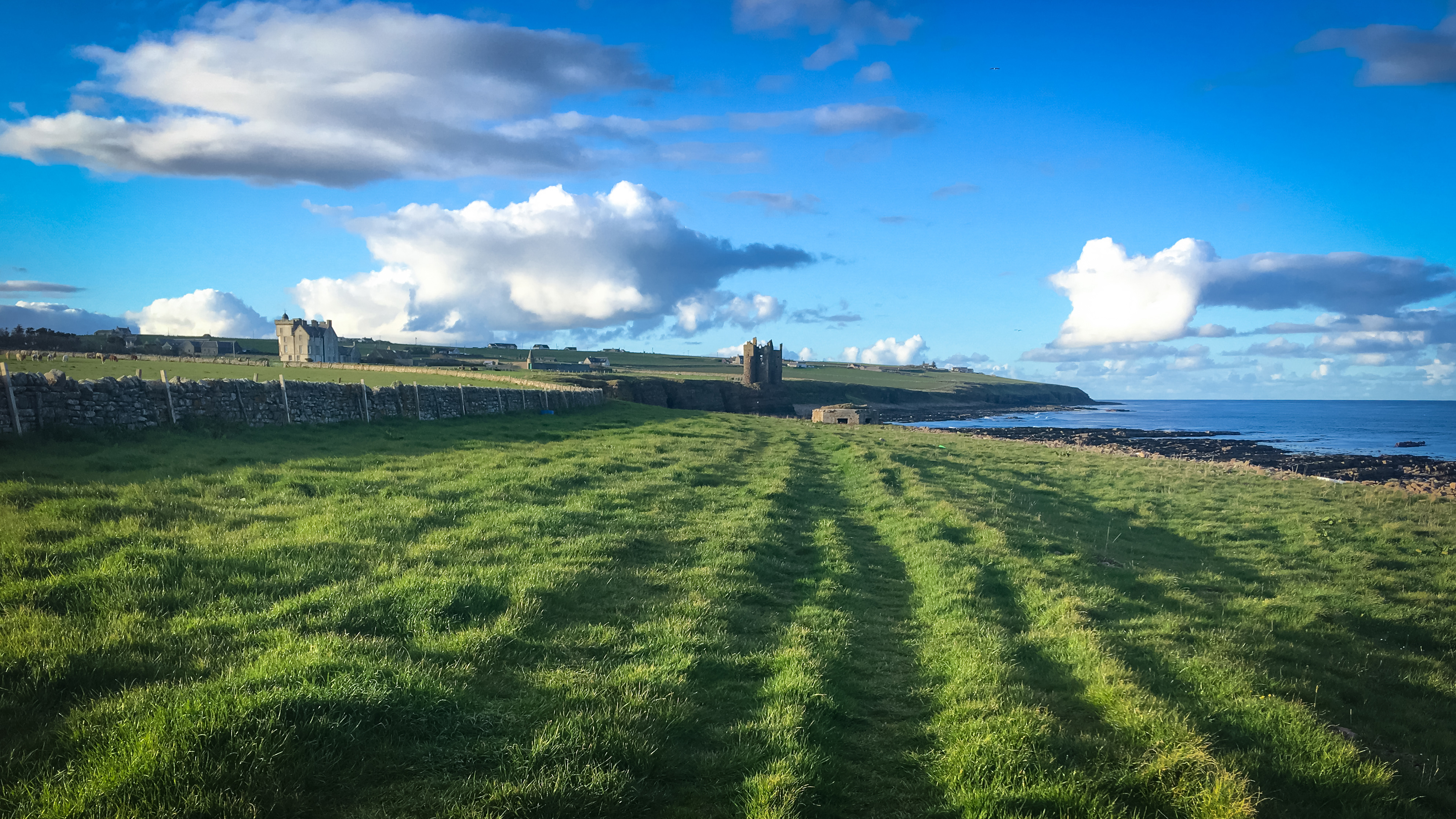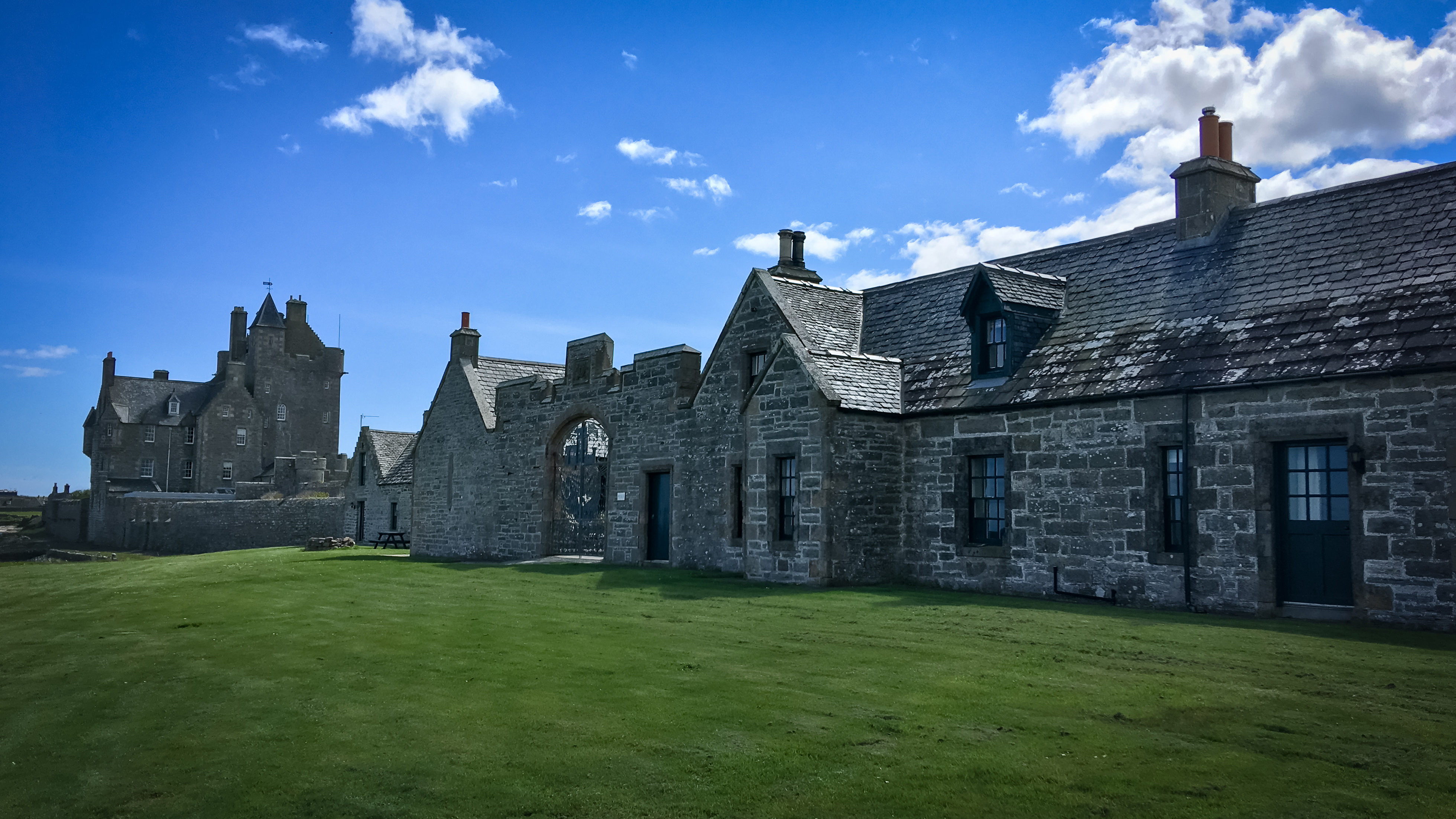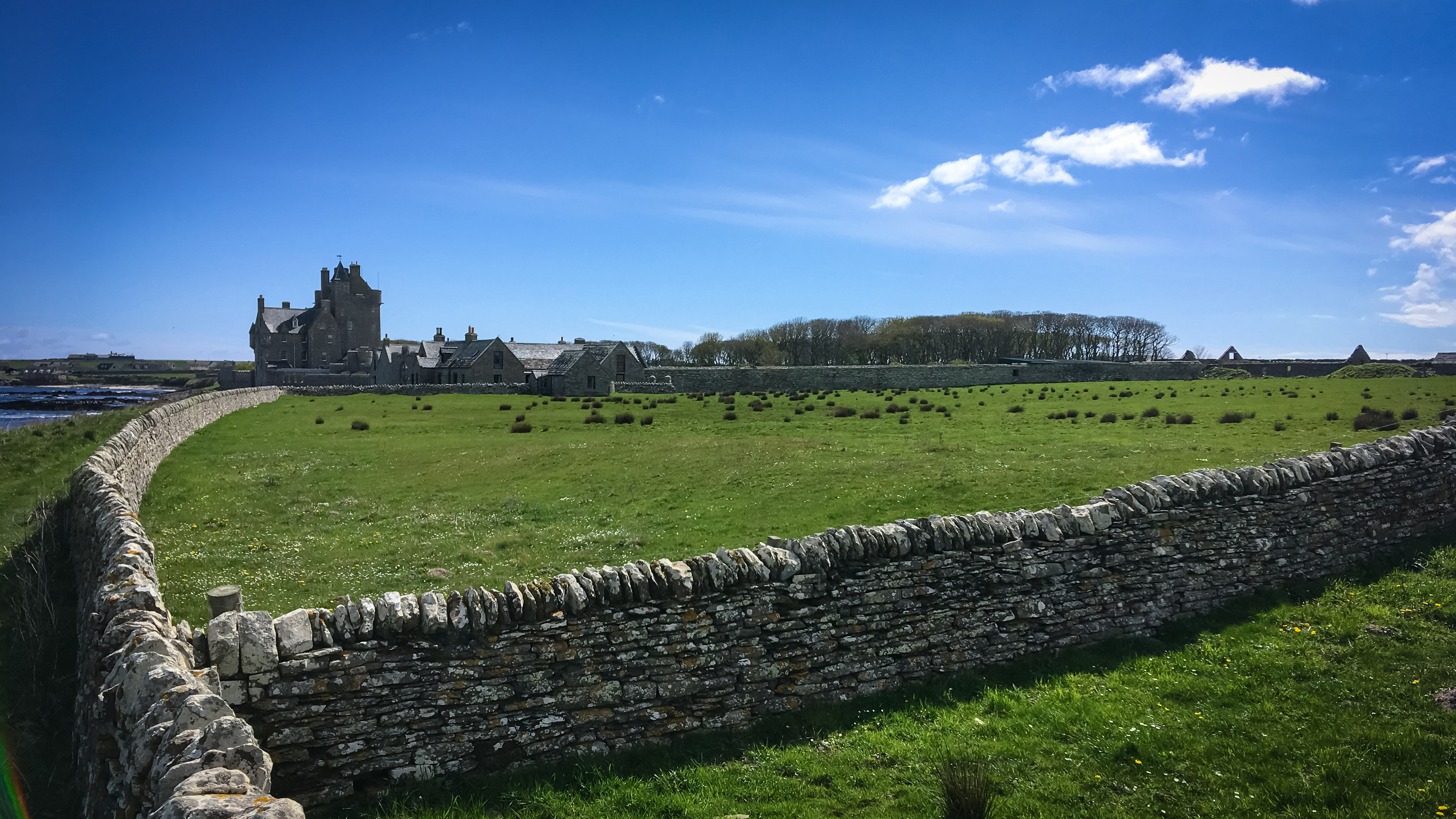 Wir durchqueren den Ort landeinwärts und biegen nach den letzten Häuser wieder Richtung Küste hinunter ab. An einem Spielplatz vorbei geht es über Gras zu einem großen, imposanten Gebäudekomplex, dem Ackergill Tower, den wir seeseitig erreichen. Alles dicht, von hohen Mauern umgeben und Private. Kein Tearoom.